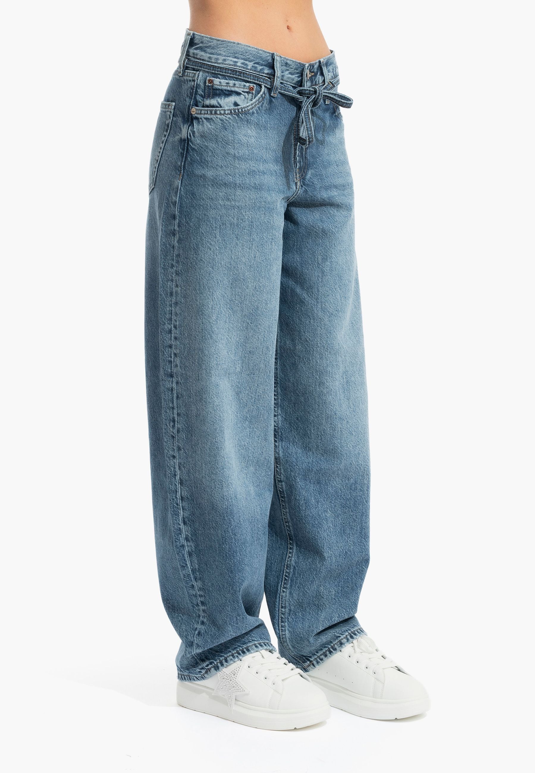 Indossa con sicurezza questi jeans cargo dalla silhouette balloon fit che si adatta perfettamente tra lavoro e tempo libero. La vestibilità rilassata e la vita media garantiscono comfort tutto il giorno, mentre il denim robusto con finiture a coste diagonali assicura durabilità. Il lavaggio medio conferisce quel caratteristico aspetto vissuto e autentico. Completo di cintura, sono il capo versatile che cercavi per uno stile senza compromessi. LUNGHEZZA "32. La modella è alta 175 cm indossa una taglia 27