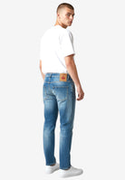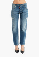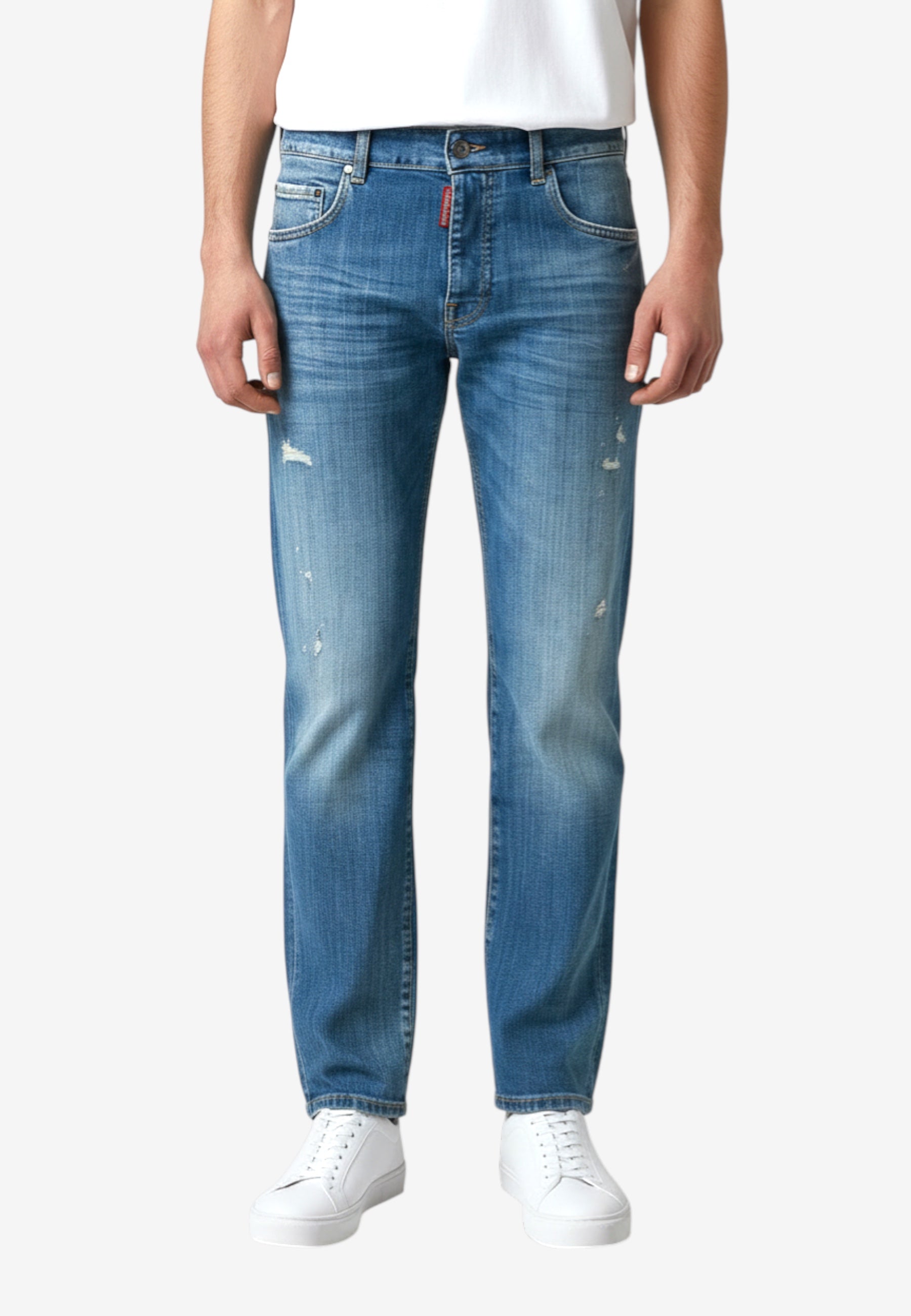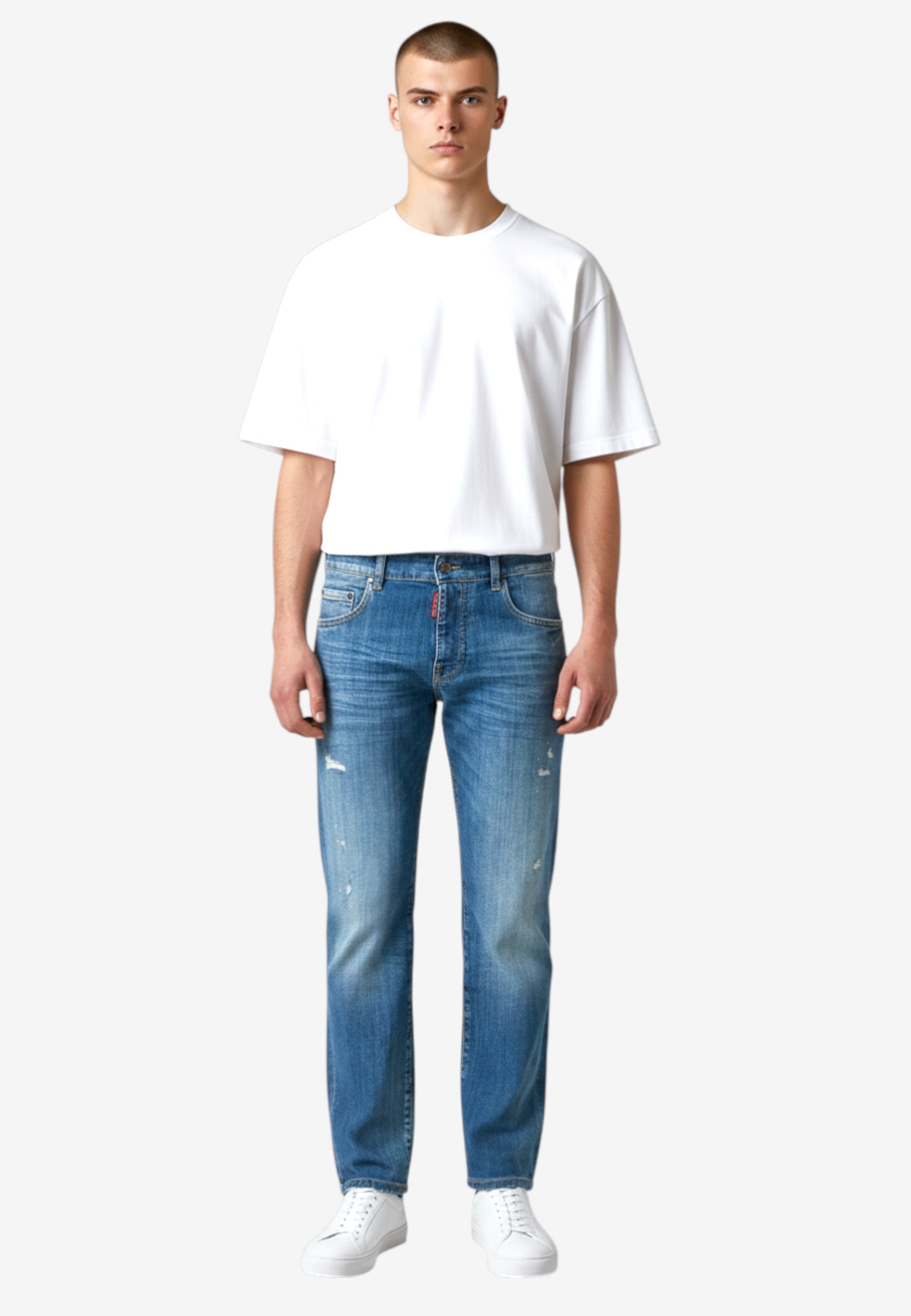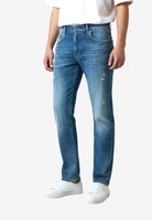 Denim effetto usato con abrasioni e piccoli strappi