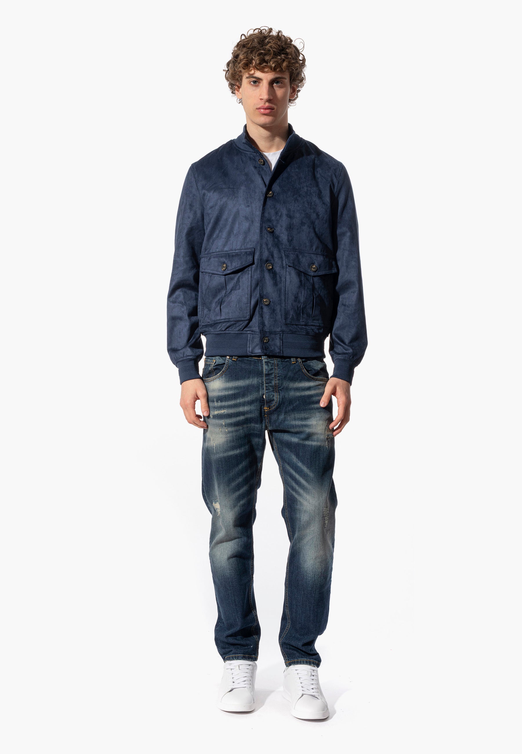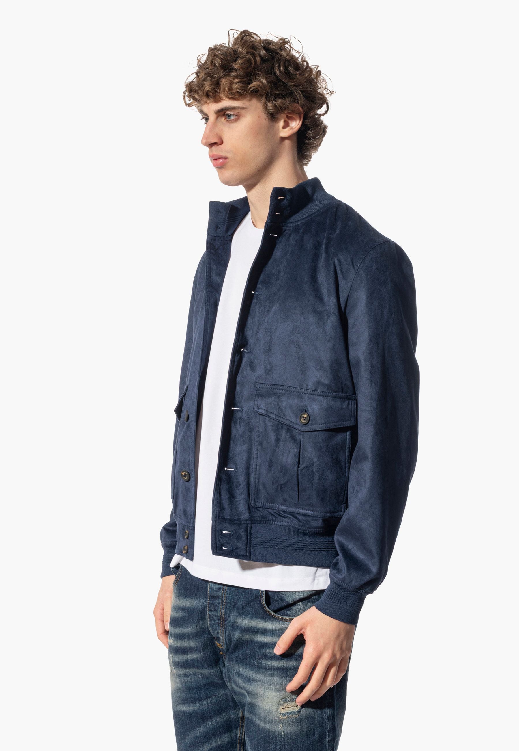 Giacca Bomber in eco dainetto firmato Markup, colletto e polsini in maglia a coste, tasche laterali a scomparsa e tasche frontali applicate con chiusura bottone.