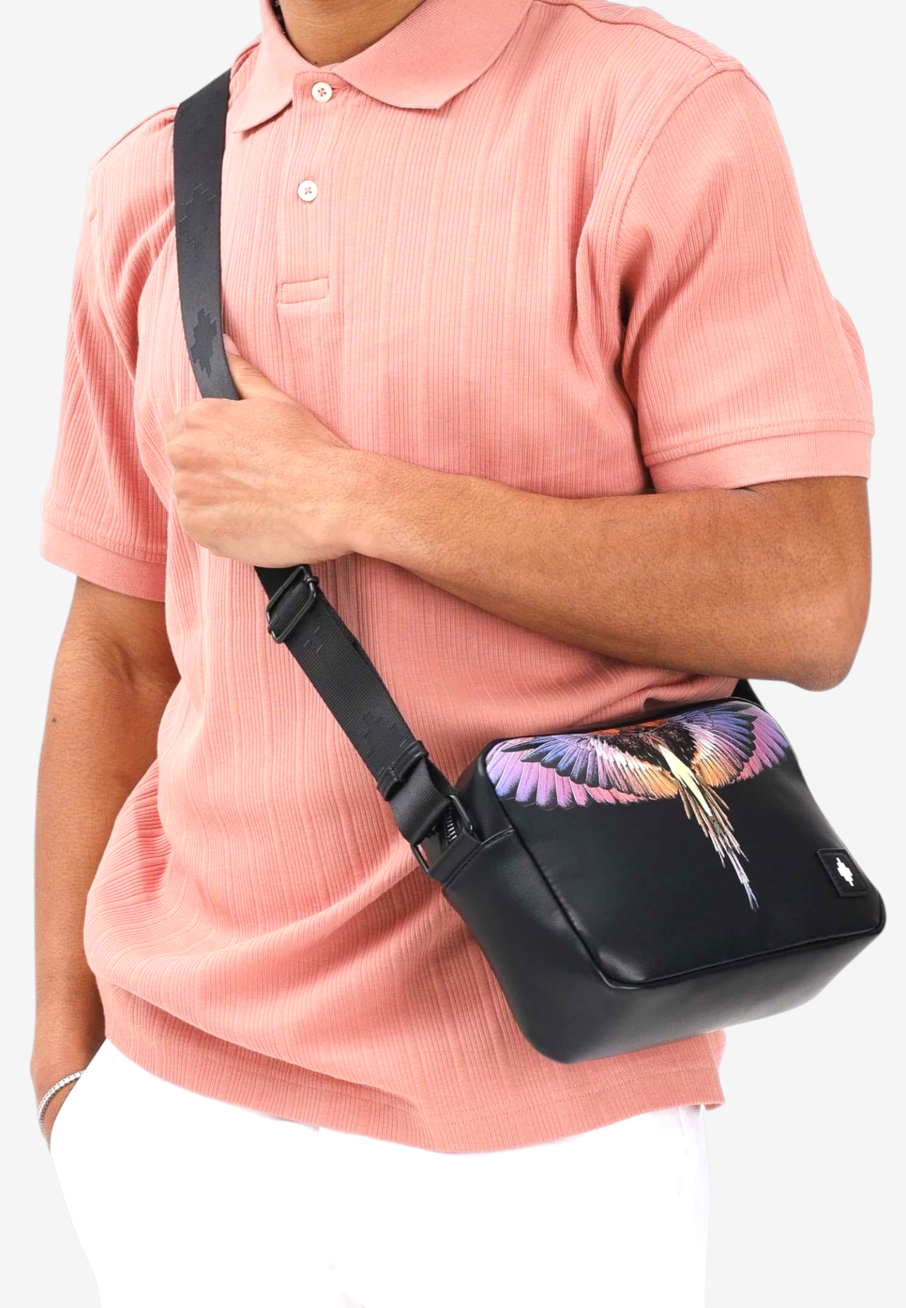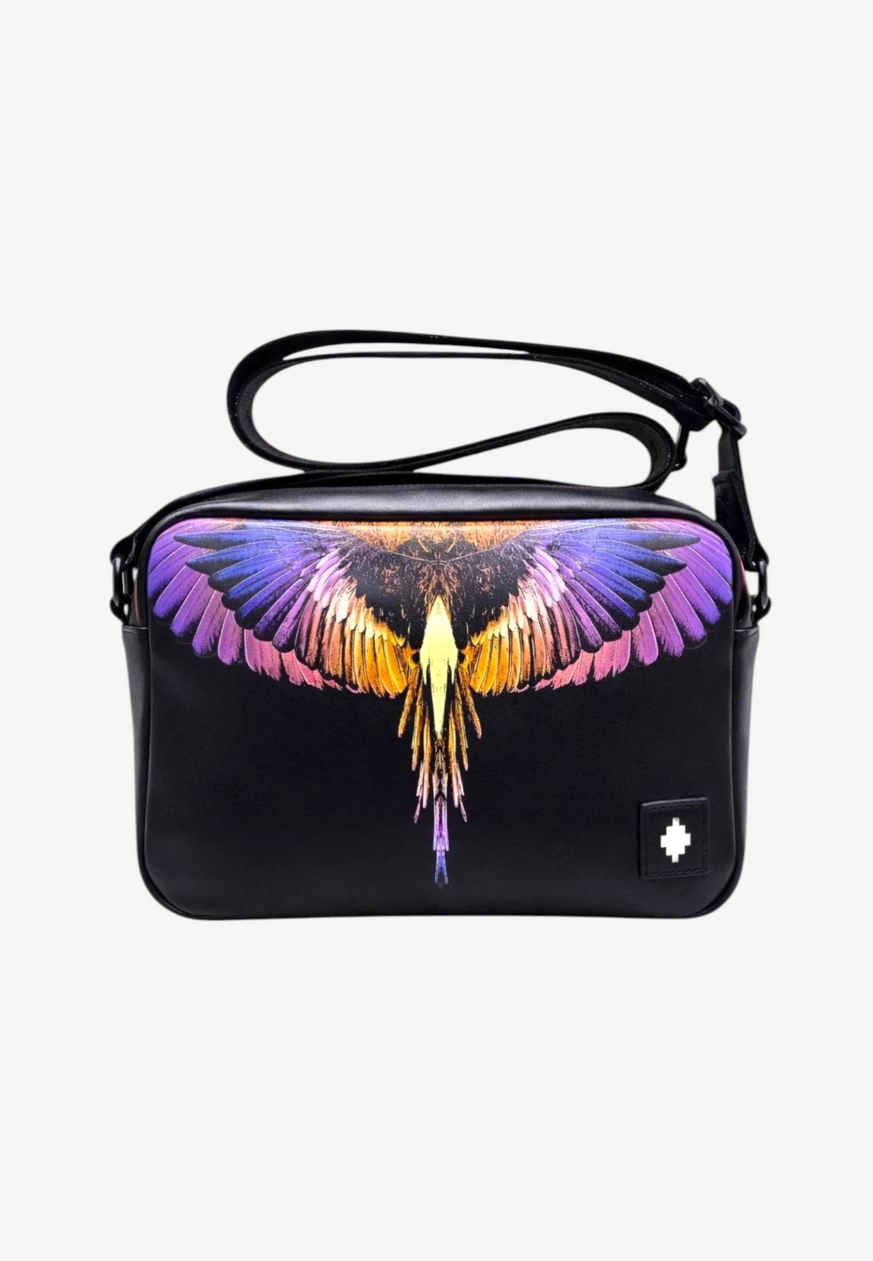 Borsa a tracolla nera per uomo e donna. Il modello è caratterizzato sul frontale dall'iconica stampa con ali multicolor, simbolo distintivo del brand, che dona un forte carattere grafico al look. Dotata di chiusura con zip e di tracolla regolabile, permette di essere indossata comodamente a spalla o crossbody. Il formato compatto ma capiente la rende perfetta per portare con sé gli oggetti essenziali durante la giornata. Completata dal logo County of Milan applicato sul frontale, è un accessorio ideale per completare outfit casual e streetwear con uno stile deciso.