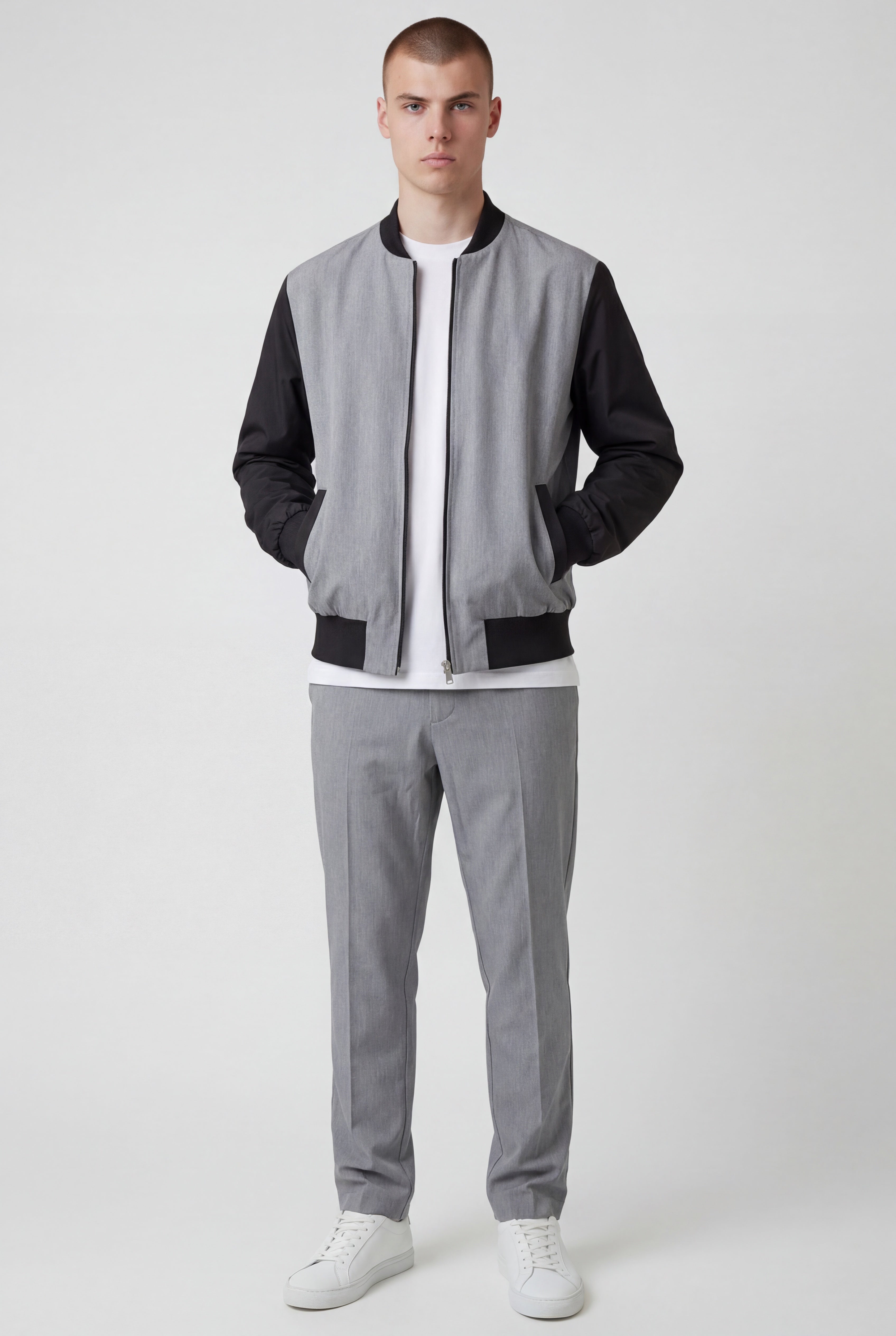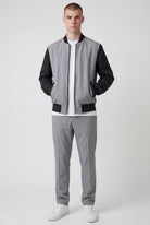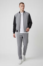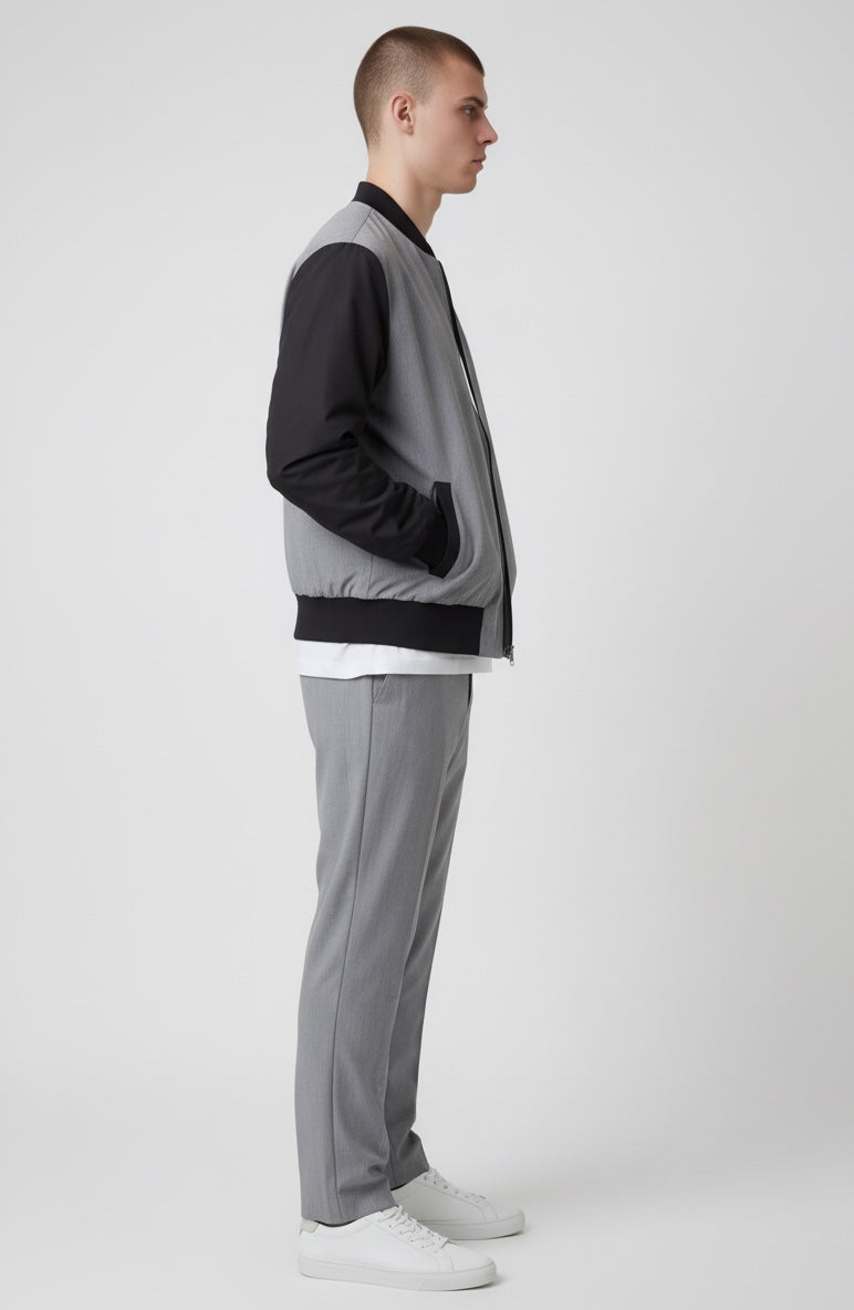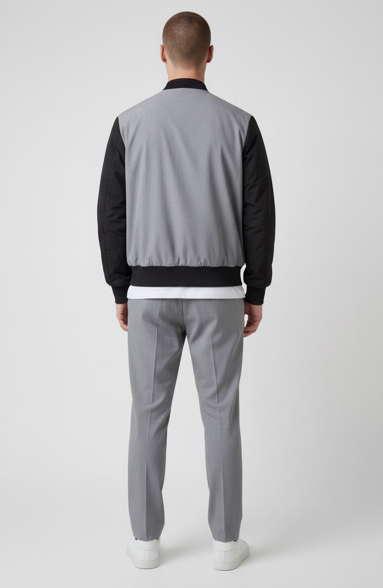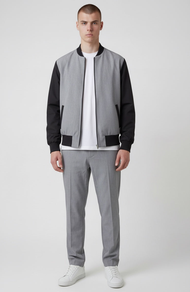 Coordinato sofisticato che unisce comfort e stile contemporaneo. La giacca bomber presenta collo e polsini in costine elasticizzate, realizzata in lana grigio fiammato con maniche in nylon per una texture ricercata. Il pantalone con ventre piatto offre una silhouette elegante, completato da elastico posteriore in cintura per una vestibilità rilassata e pratica. Perfetto per chi ricerca un look curato senza compromessi sulla comodità quotidiana.