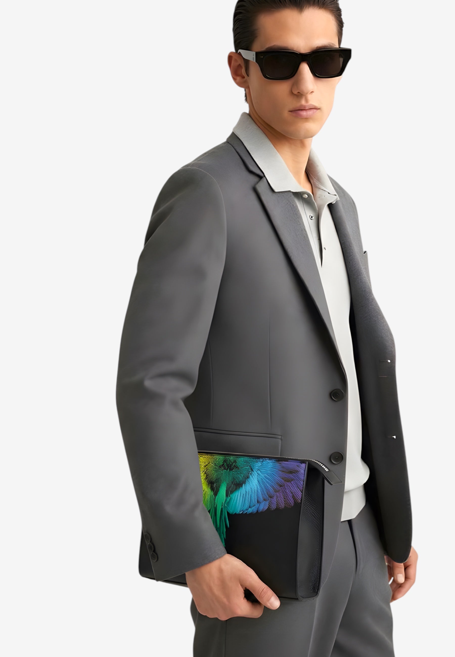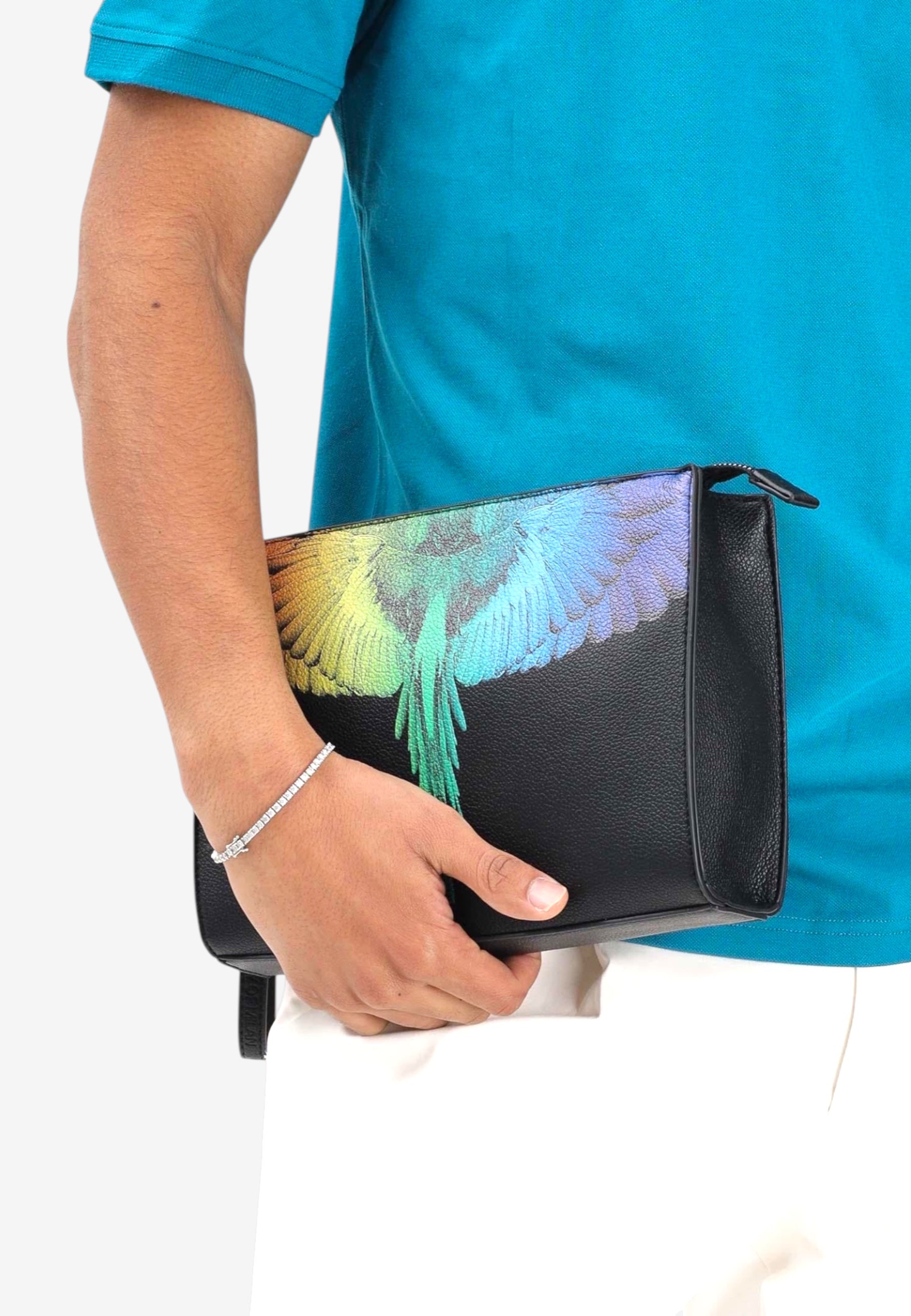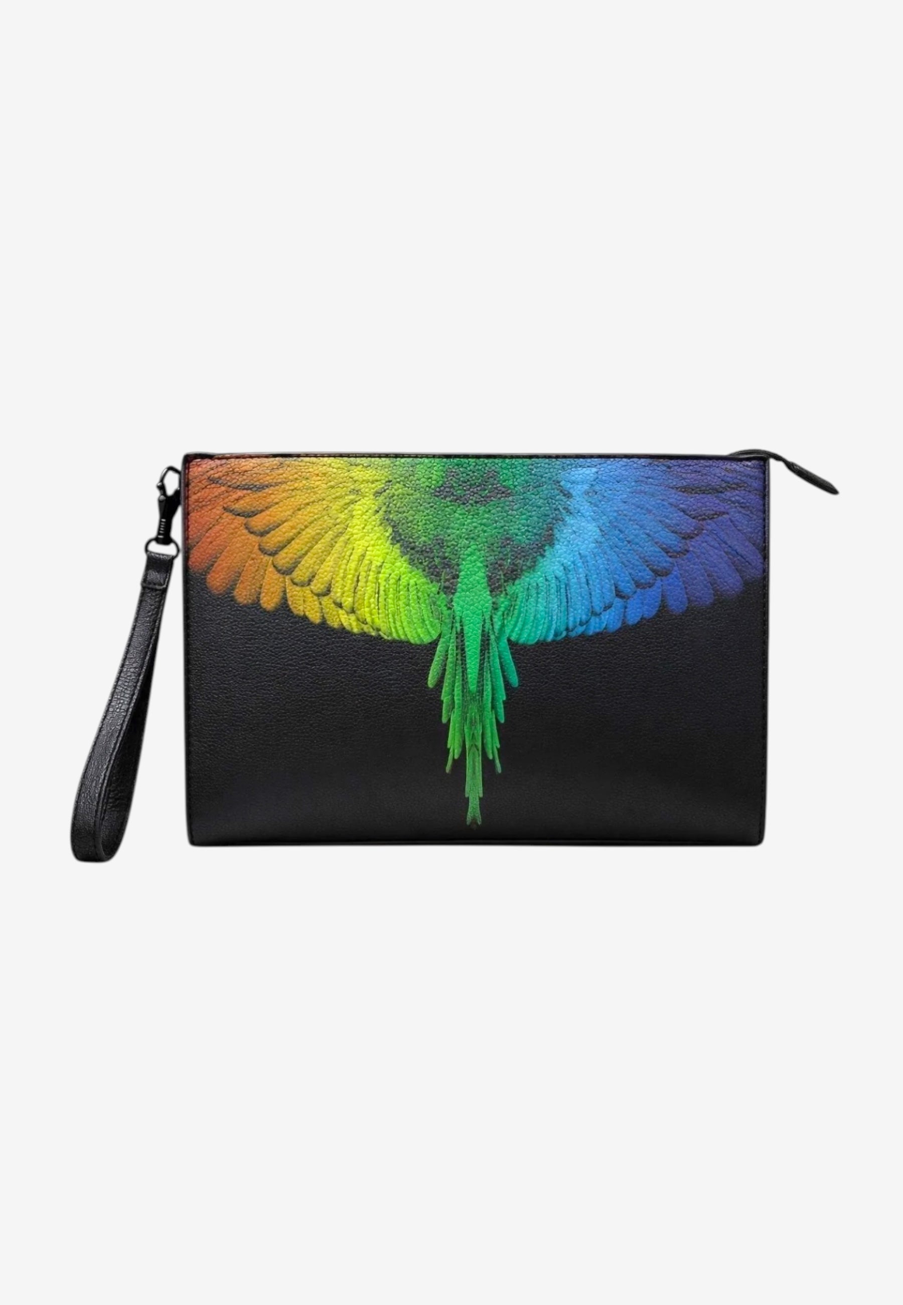 Pochette nera per uomo e donna dal design iconico e contemporaneo. Realizzata in materiale resistente di colore nero, è impreziosita sul frontale dalla caratteristica stampa con ali multicolor, simbolo distintivo del brand. Dotata di chiusura con zip e pratico laccetto da polso, è perfetta da portare a mano o da utilizzare all'interno della borsa per organizzare gli oggetti essenziali. Un accessorio dallo stile deciso, ideale per completare look casual e streetwear.