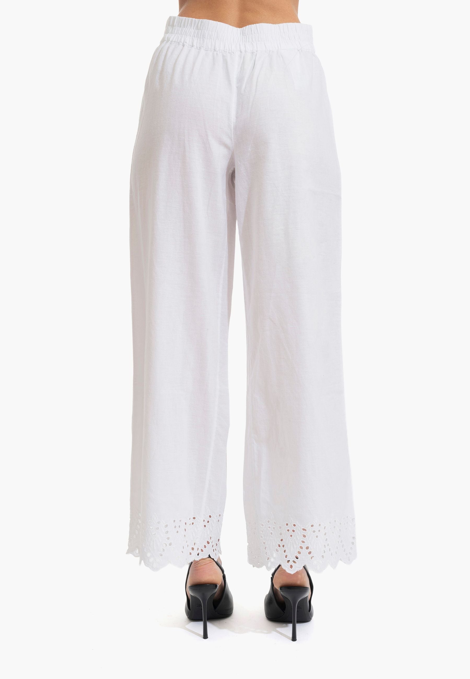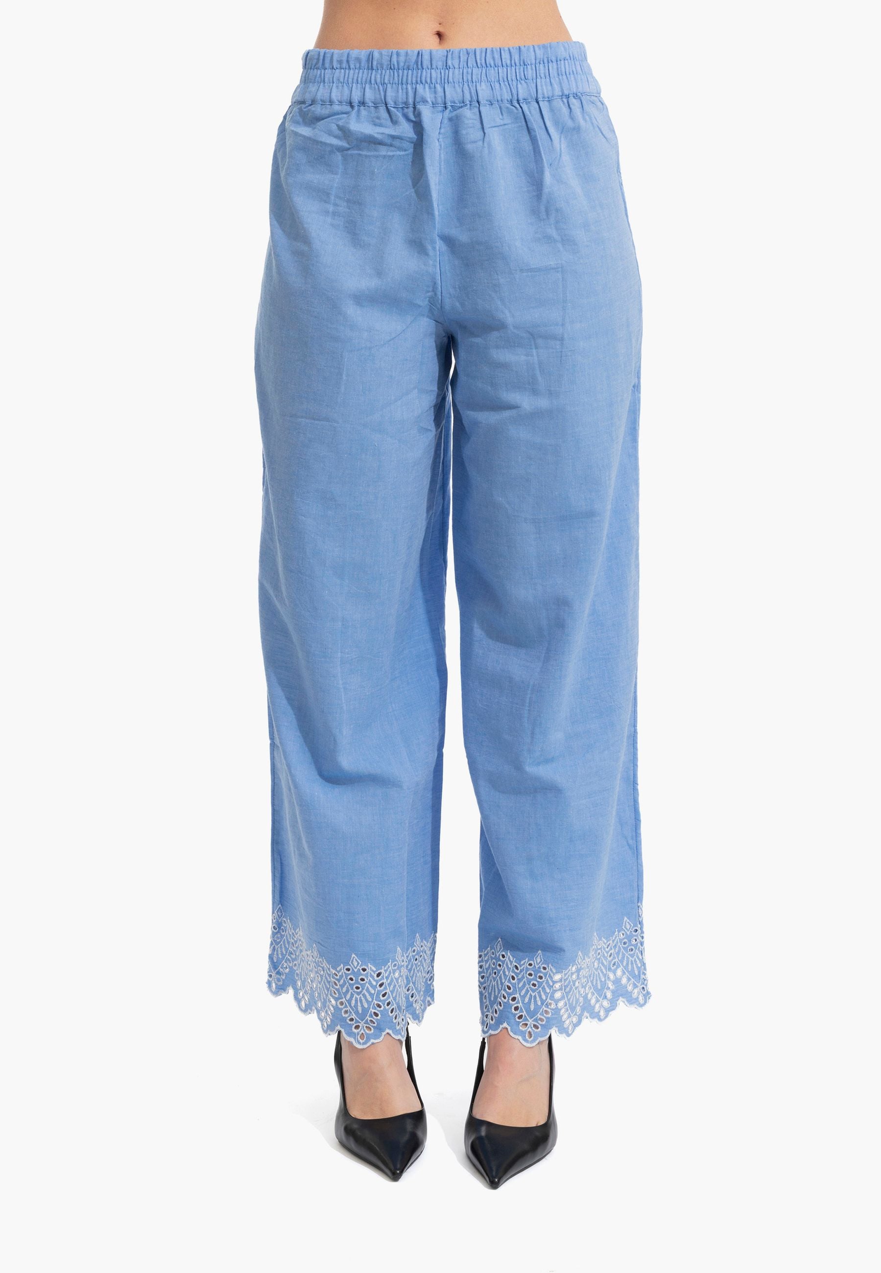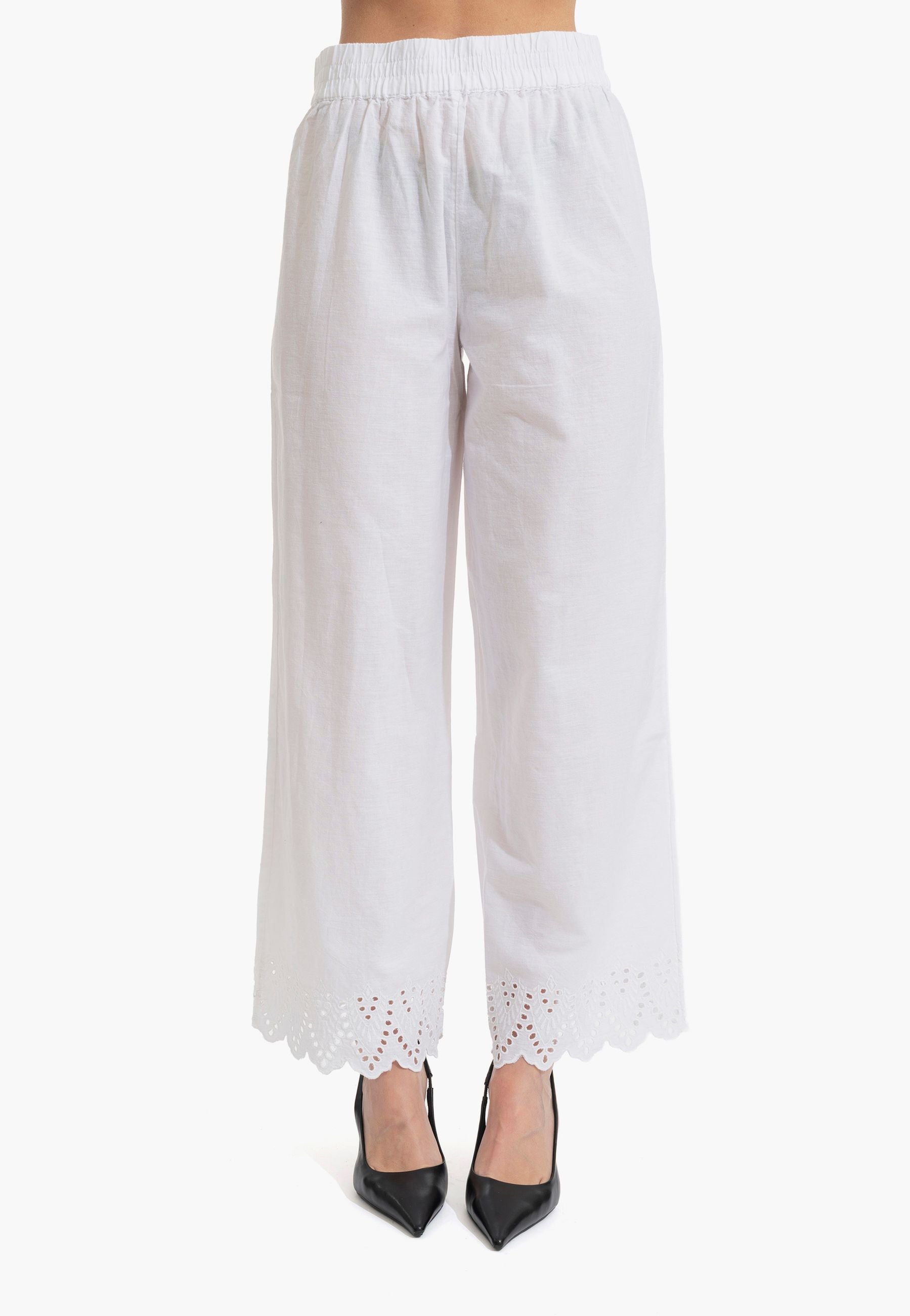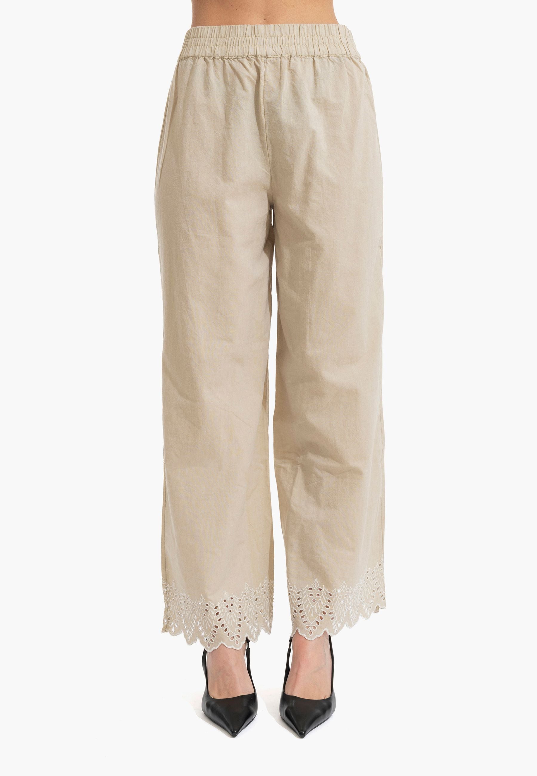 Pantalone palazzo in puro cotone leggero con coulisse regolabile e ricamo distintivo al fondo. Silhouette comoda e fresca, perfetta per la stagione estiva. Design senza tempo che si adatta a qualsiasi occasione, dalla città alla spiaggia. La vestibilità generosa garantisce libertà di movimento e comfort tutto il giorno. Un essenziale versatile che eleva qualsiasi outfit con eleganza femminile e semplicità sofisticata.