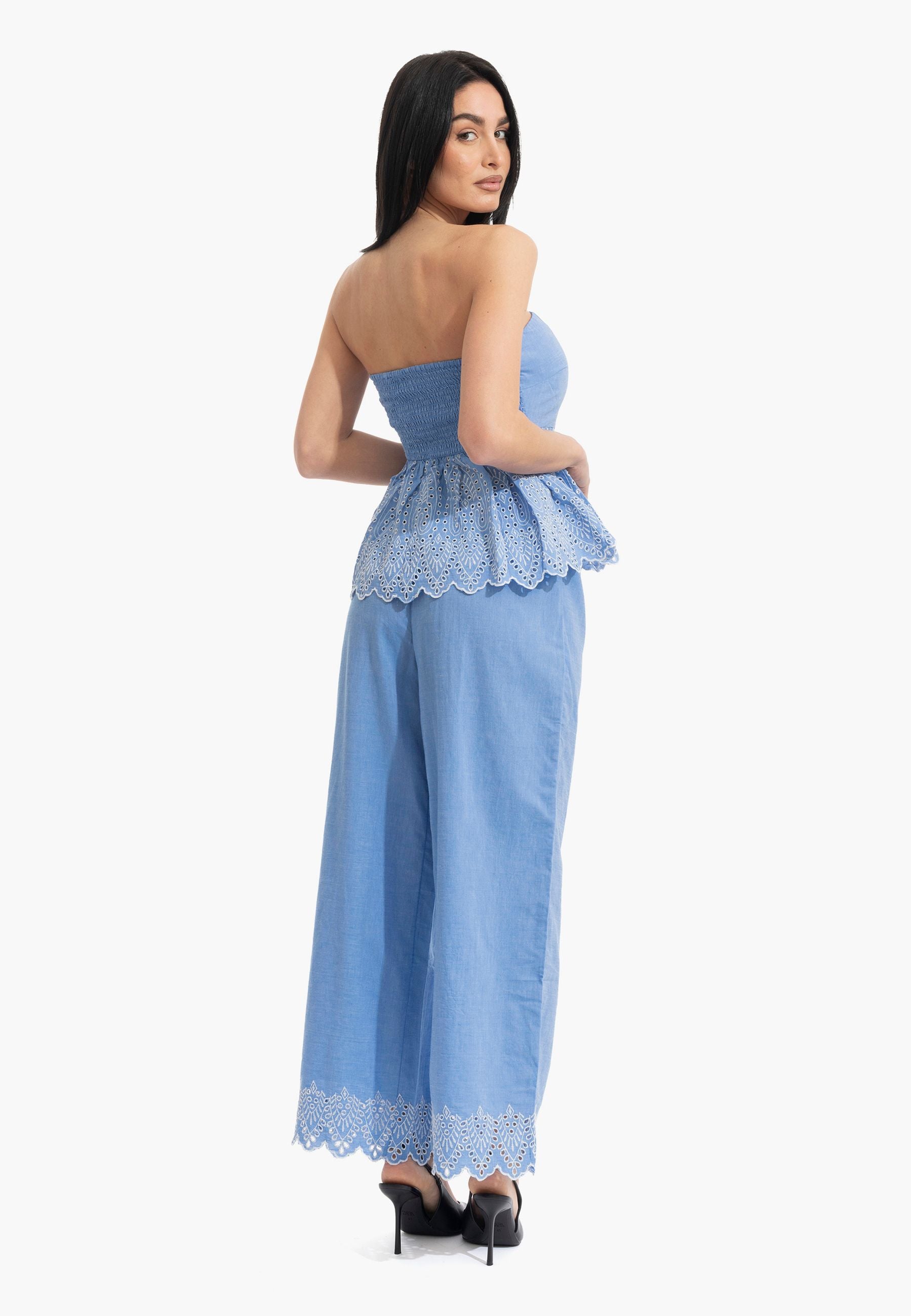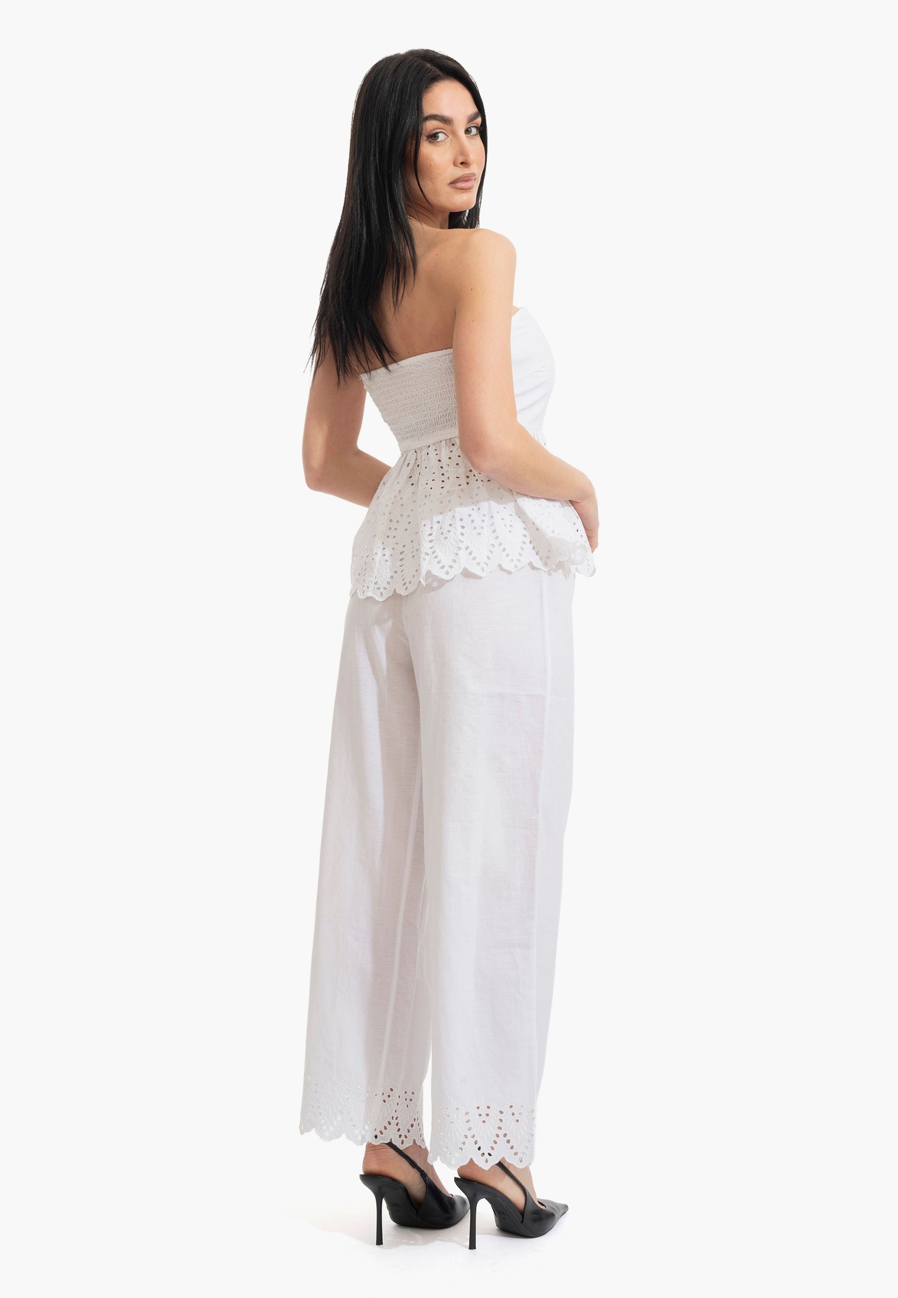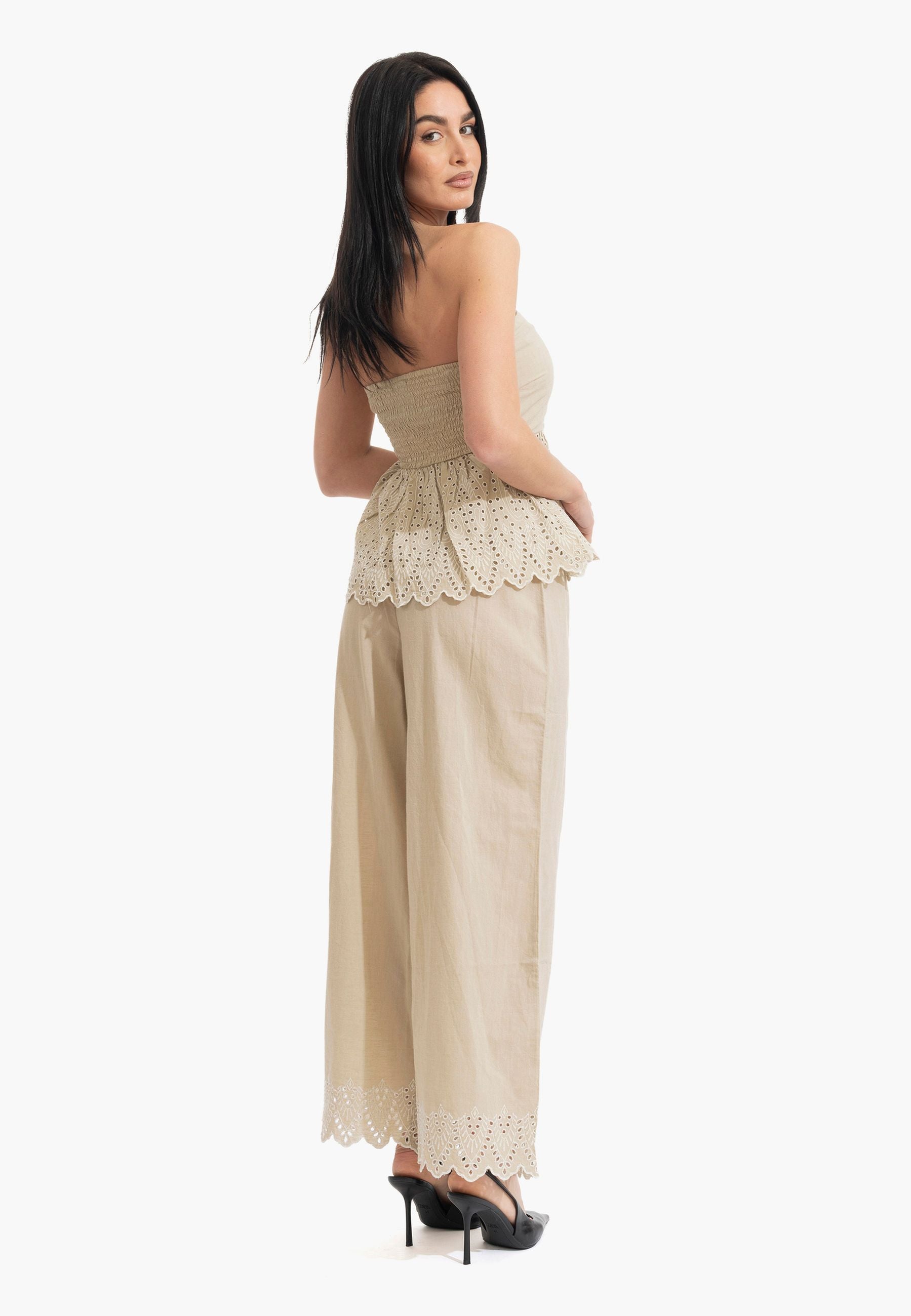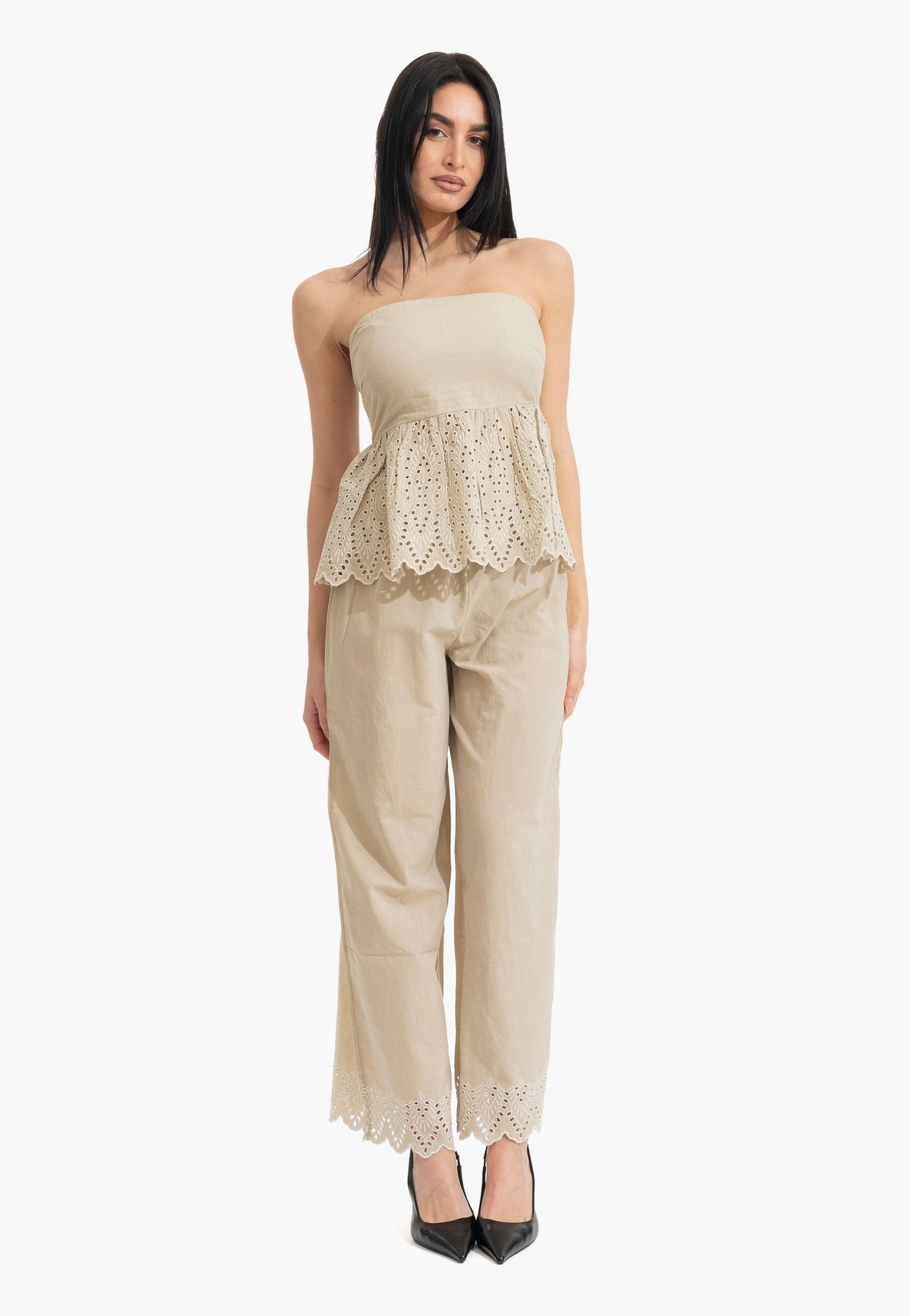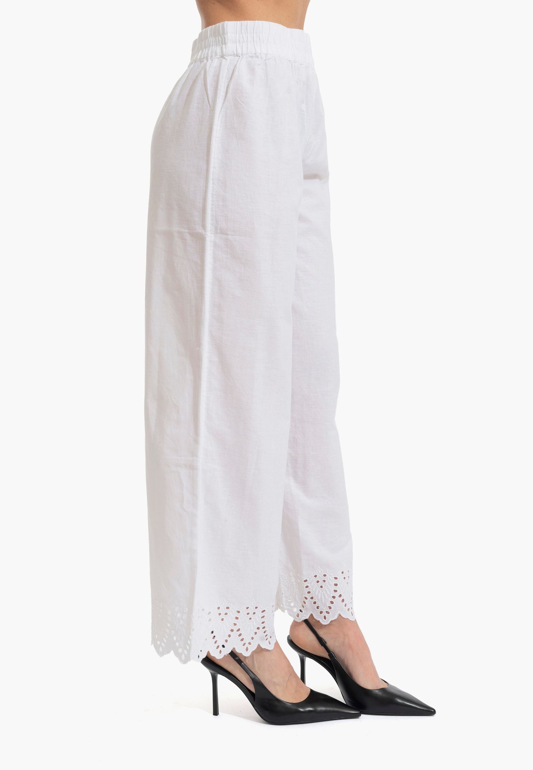 Pantalone palazzo in puro cotone leggero con coulisse regolabile e ricamo distintivo al fondo. Silhouette comoda e fresca, perfetta per la stagione estiva. Design senza tempo che si adatta a qualsiasi occasione, dalla città alla spiaggia. La vestibilità generosa garantisce libertà di movimento e comfort tutto il giorno. Un essenziale versatile che eleva qualsiasi outfit con eleganza femminile e semplicità sofisticata.