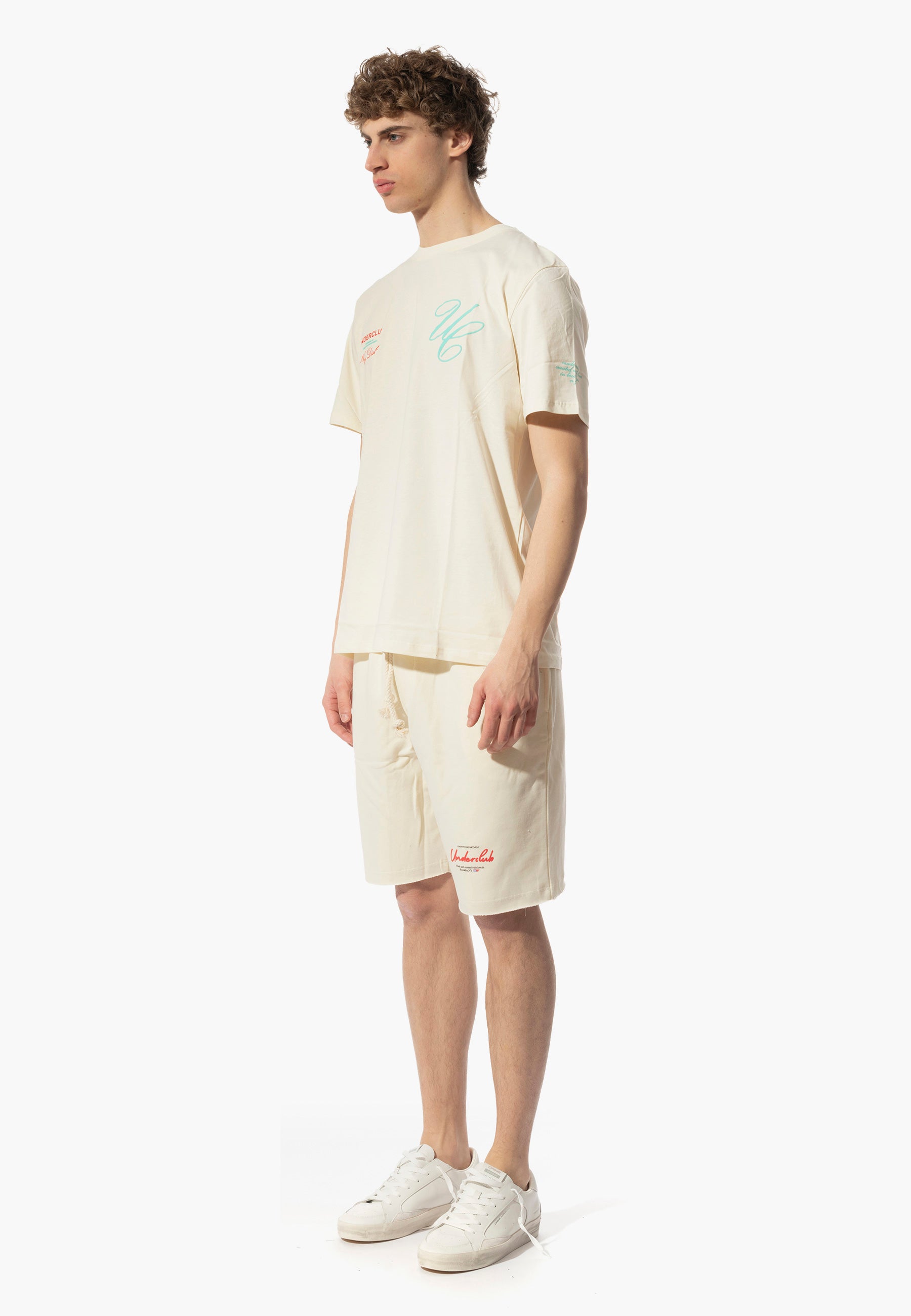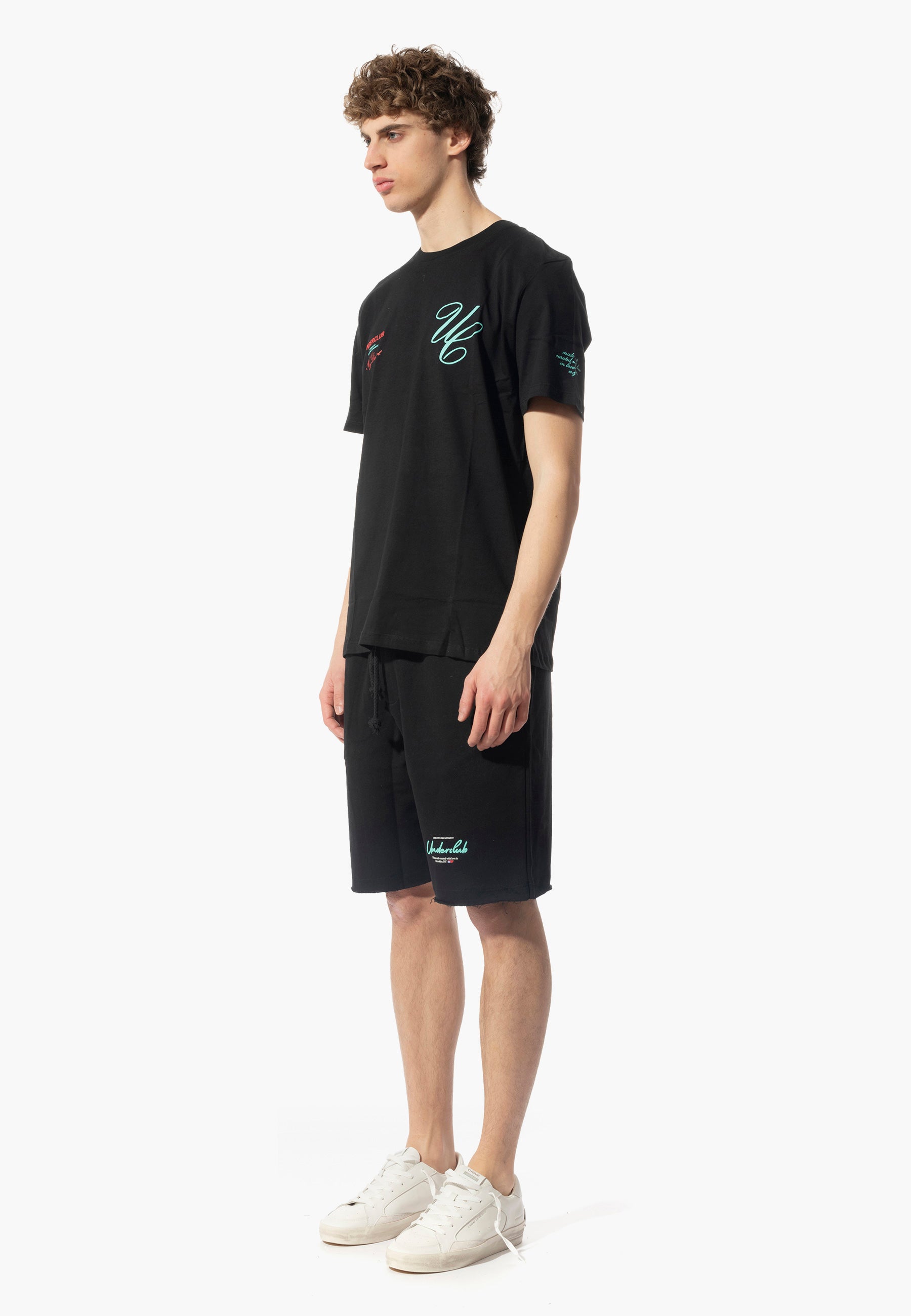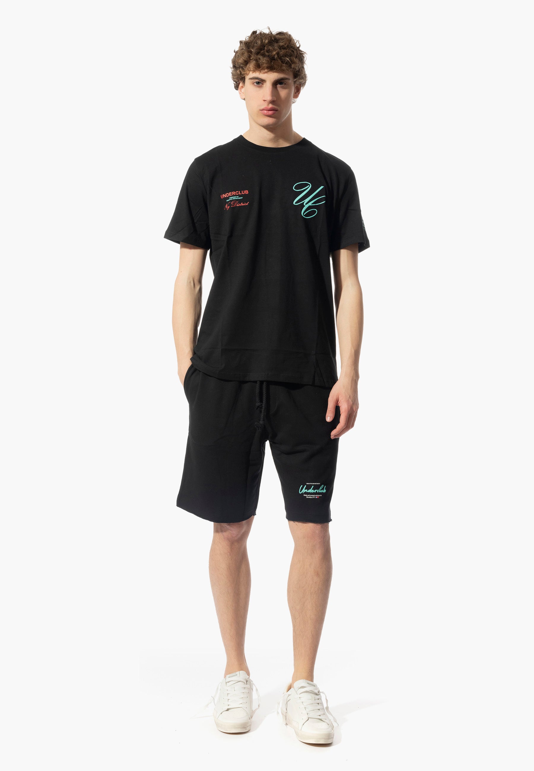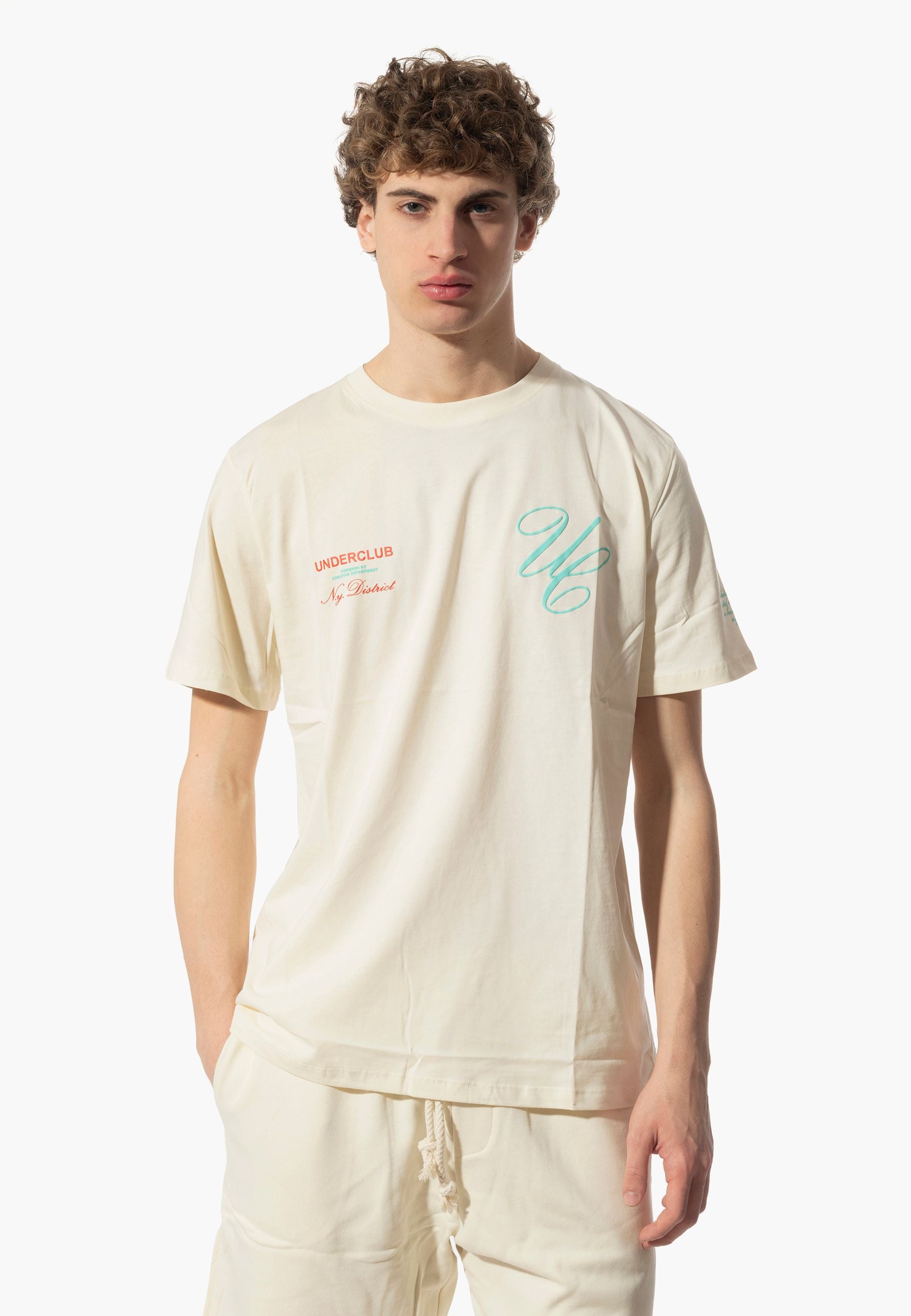 Completo Maglia e bermuda firmato Underclub, caratterizzata da tessuto in cotone organico, stampa del brand anteriore in contrasto di colore, vestibilità regolare in tessuto super leggero.