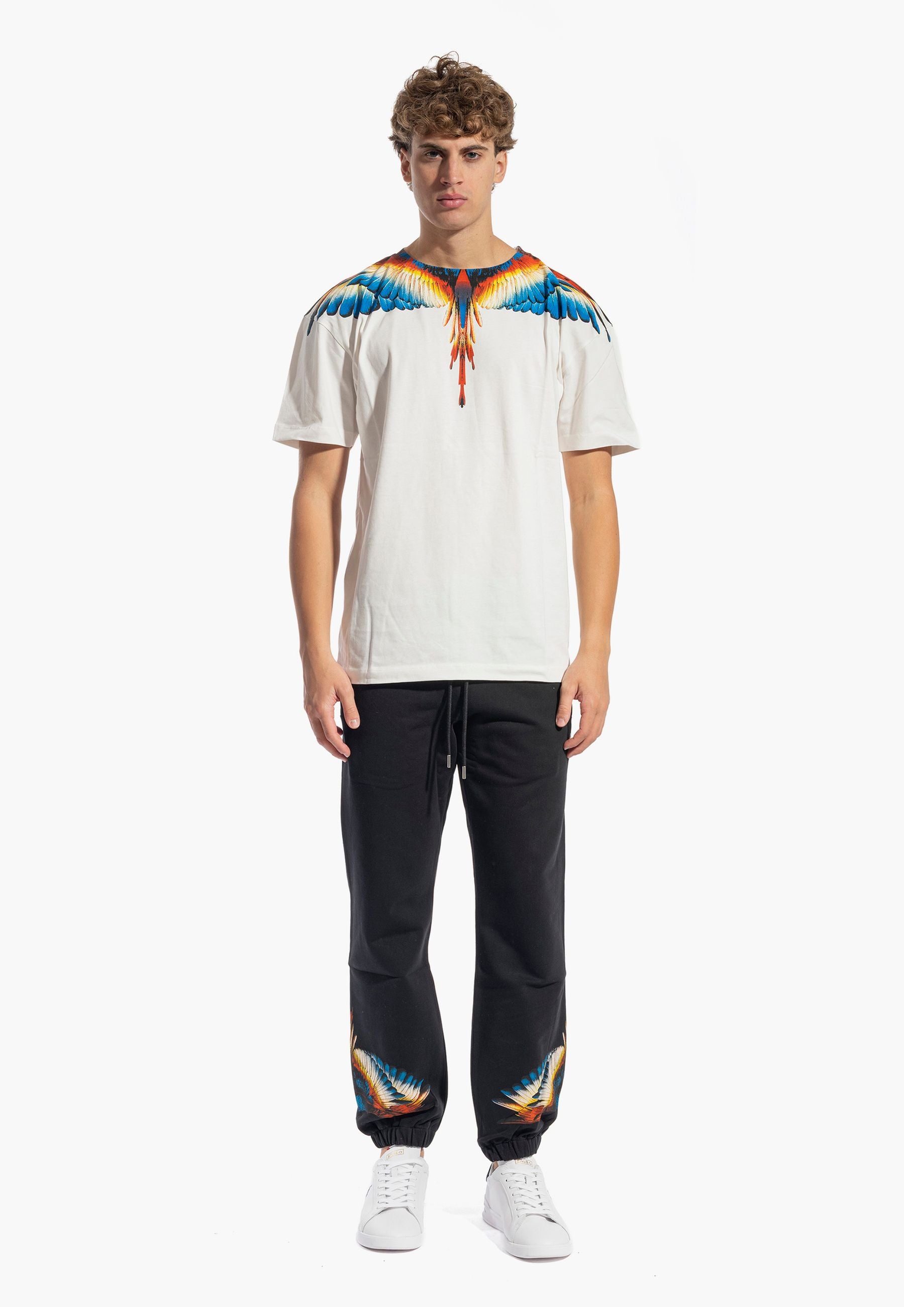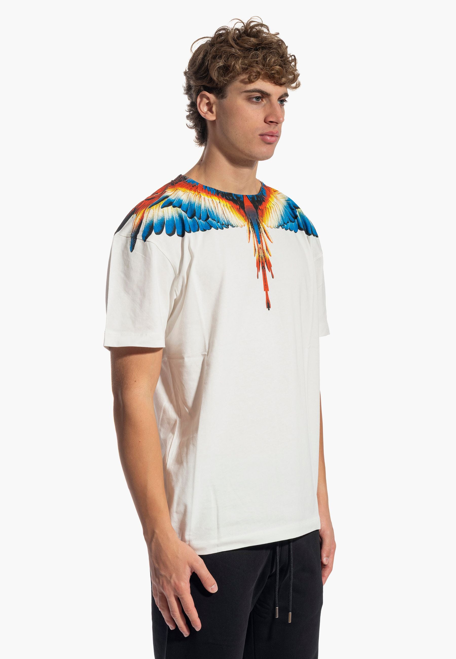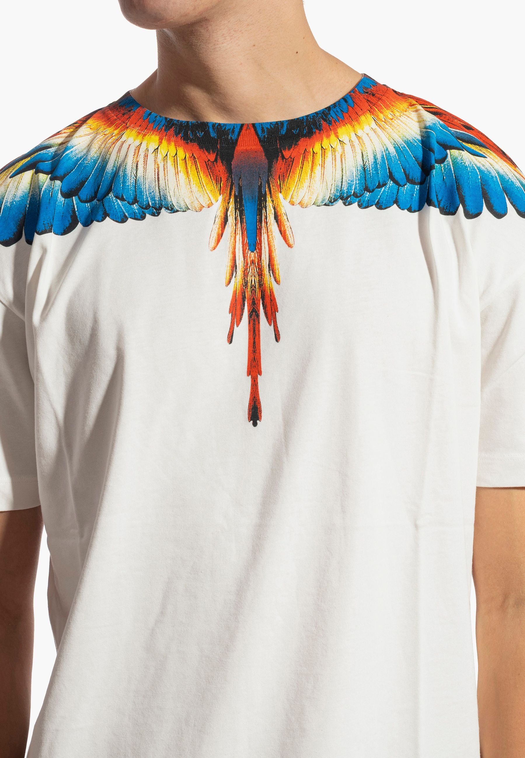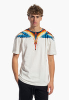 T-shirt a manica corta, caratterizzata dalla stampa di grandi ali multicolore che si aprono lungo lo scollo e le spalle, estendendosi anche sul retro. Vestibilità regular, girocollo classico e maniche corte. Un capo iconico e di forte impatto, perfetto per donare personalità anche al look più semplice.