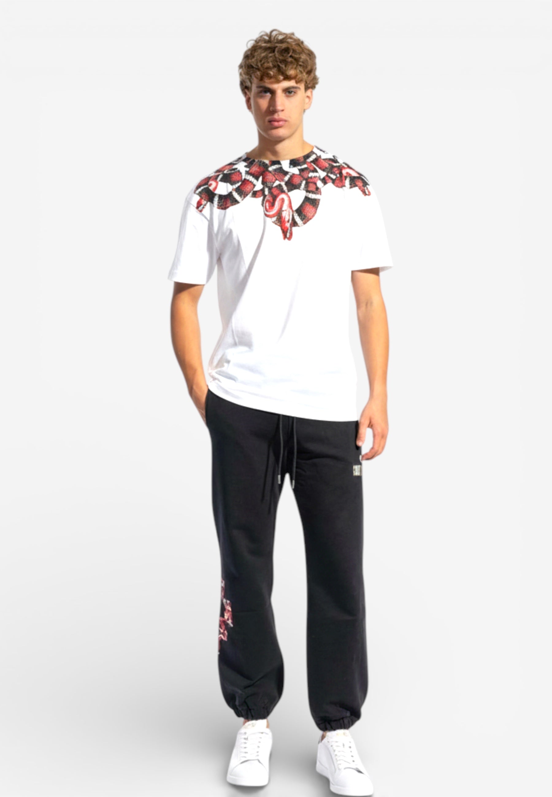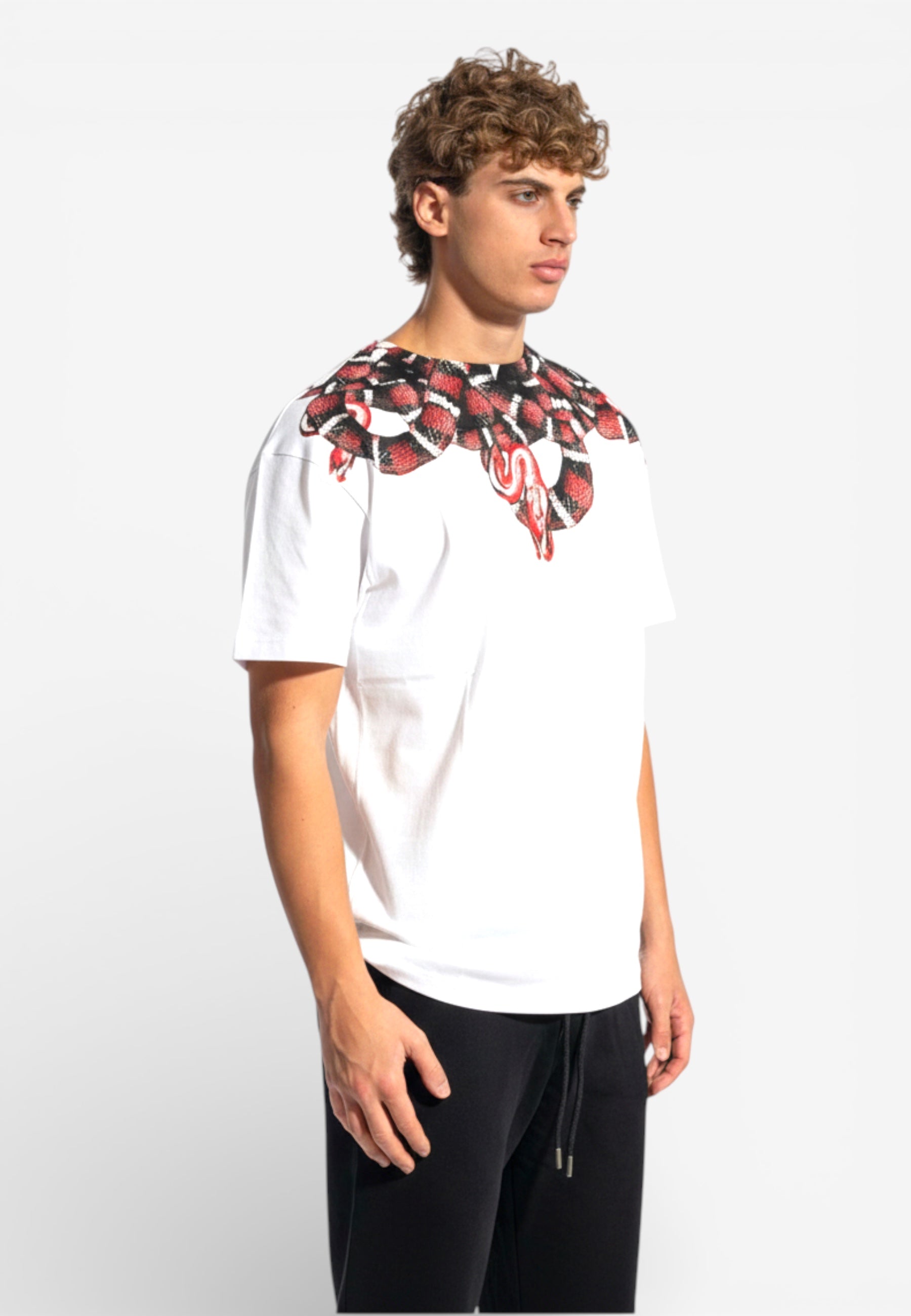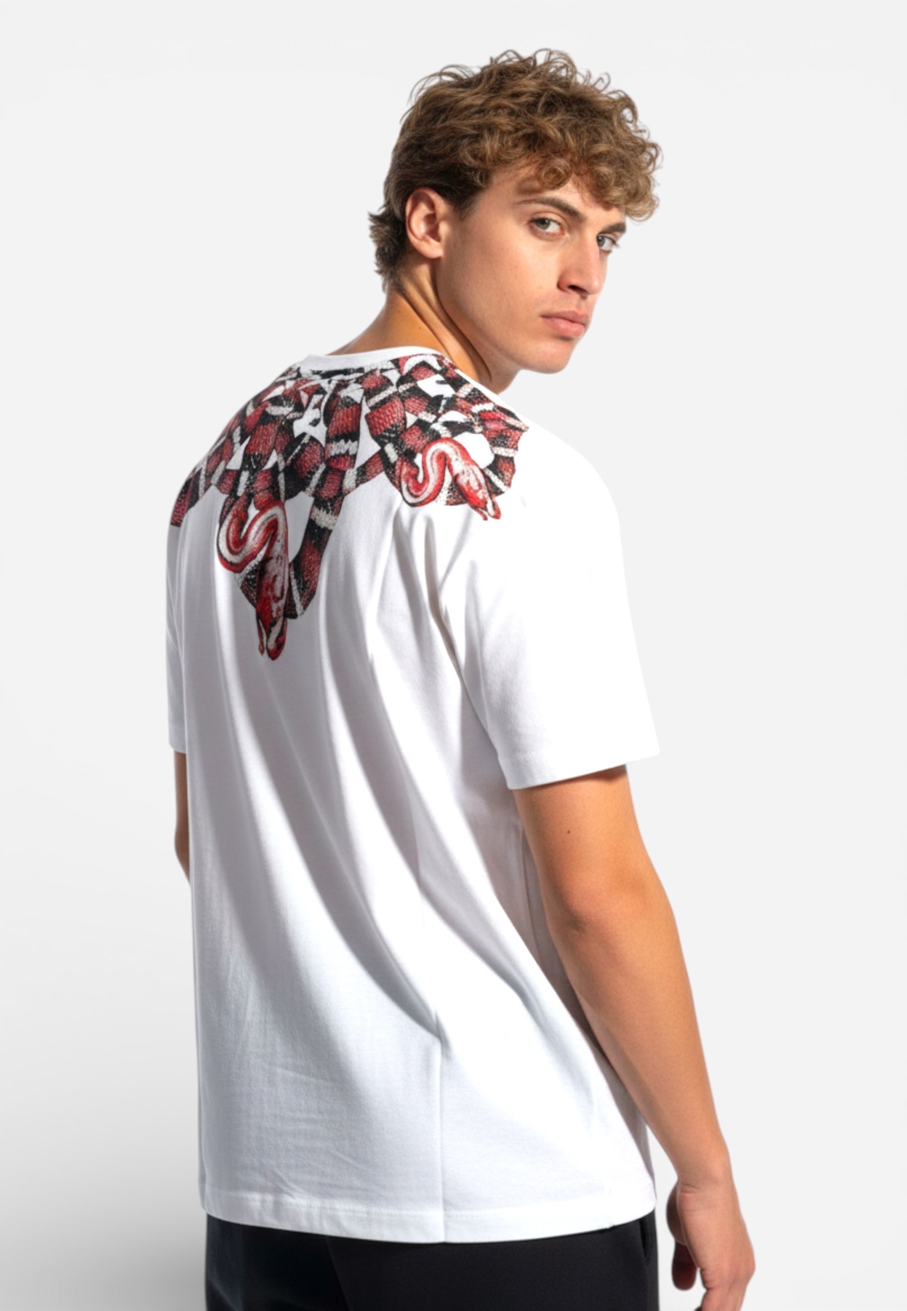 T-shirt a manica corta, dal taglio regular. Caratterizzata da un'imponente stampa serpente che avvolge spalle e scollo sia sul davanti che sul retro, per un look deciso e di carattere. Realizzata in cotone morbido, è perfetta da indossare con jeans e sneakers per outfit casual dal forte stile urbano.