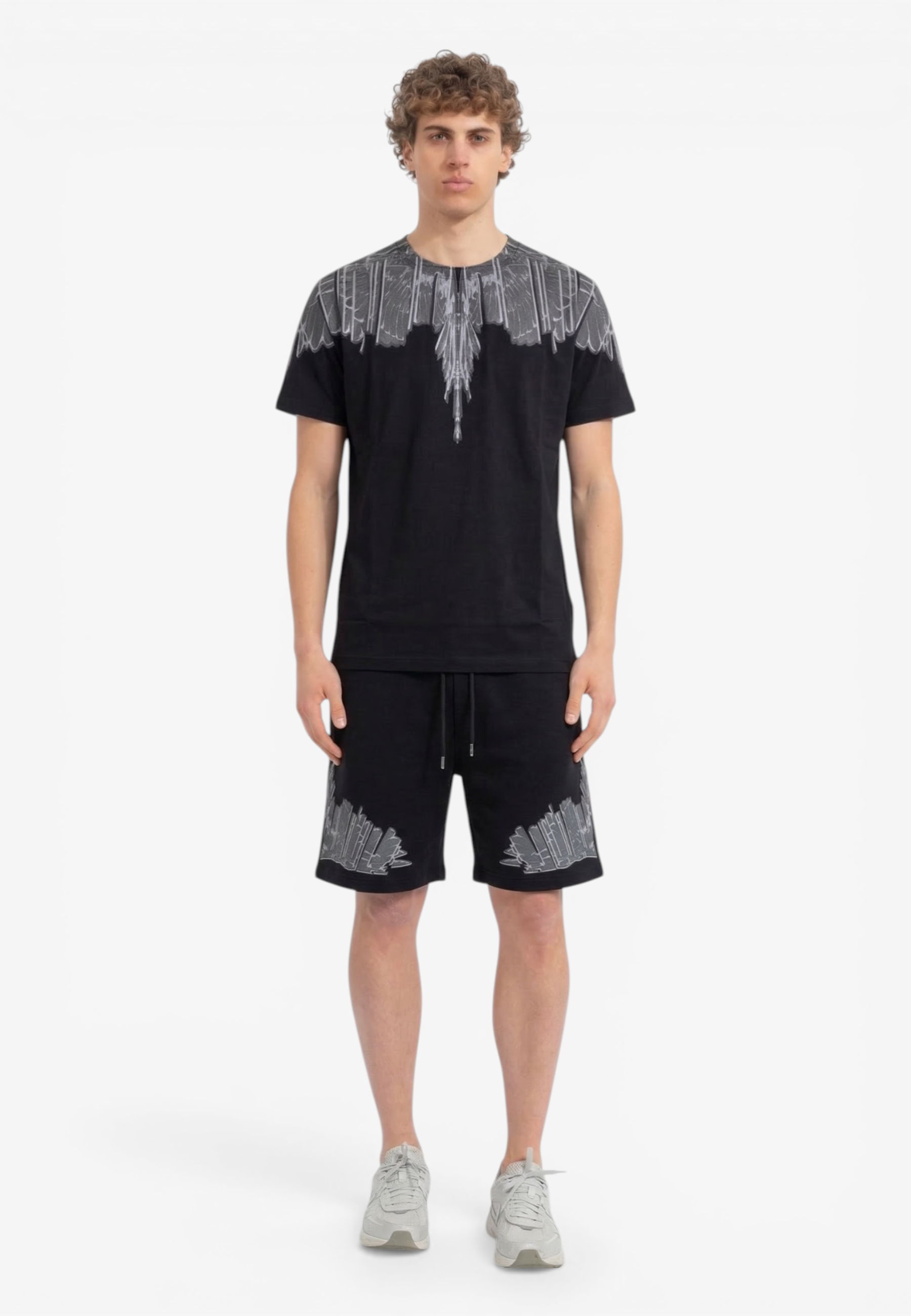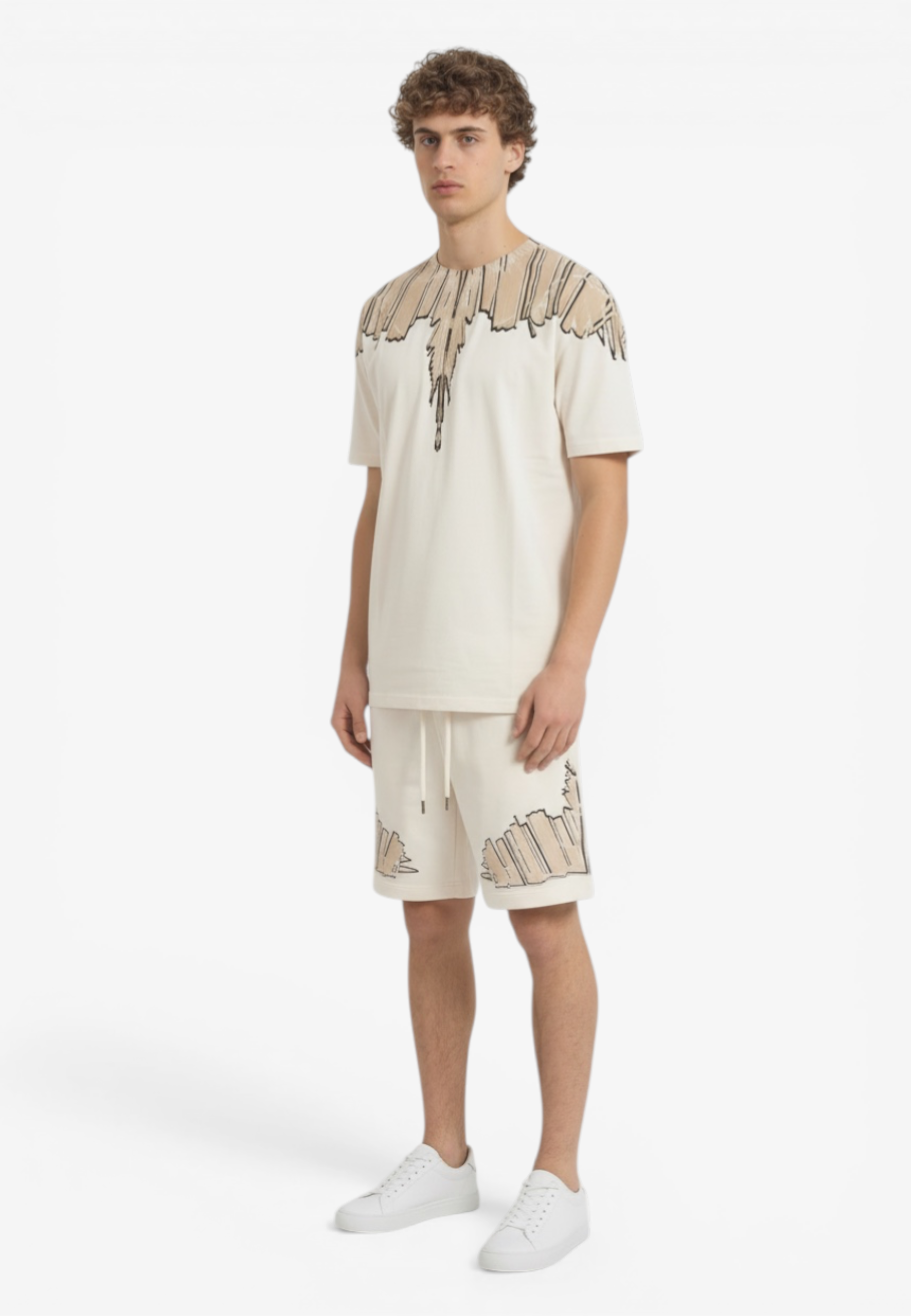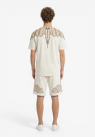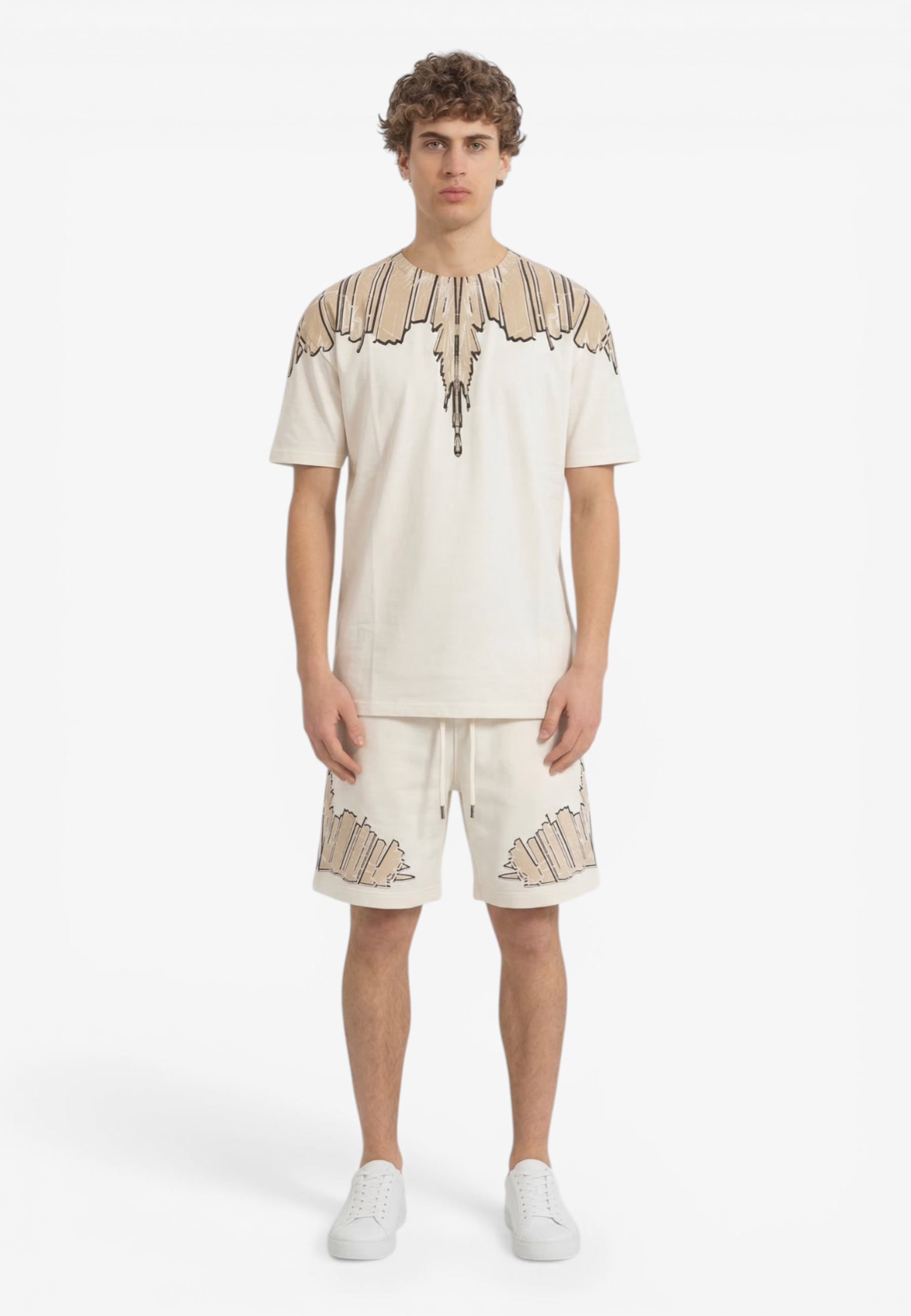 Coordinato a manica corta dal forte impatto visivo e dallo stile street contemporaneo, realizzata in cotone per offrire comfort e una vestibilità rilassata. Il design è caratterizzato da una stampa ali che avvolge collo e spalle l'estetica inconfondibile di Marcelo Burlon County of Milan. Un capo pensato per chi ama look urbani e di carattere Il modello indossa una taglia L nel colore cocco e una M nel colore nero ed è altro 187 cm