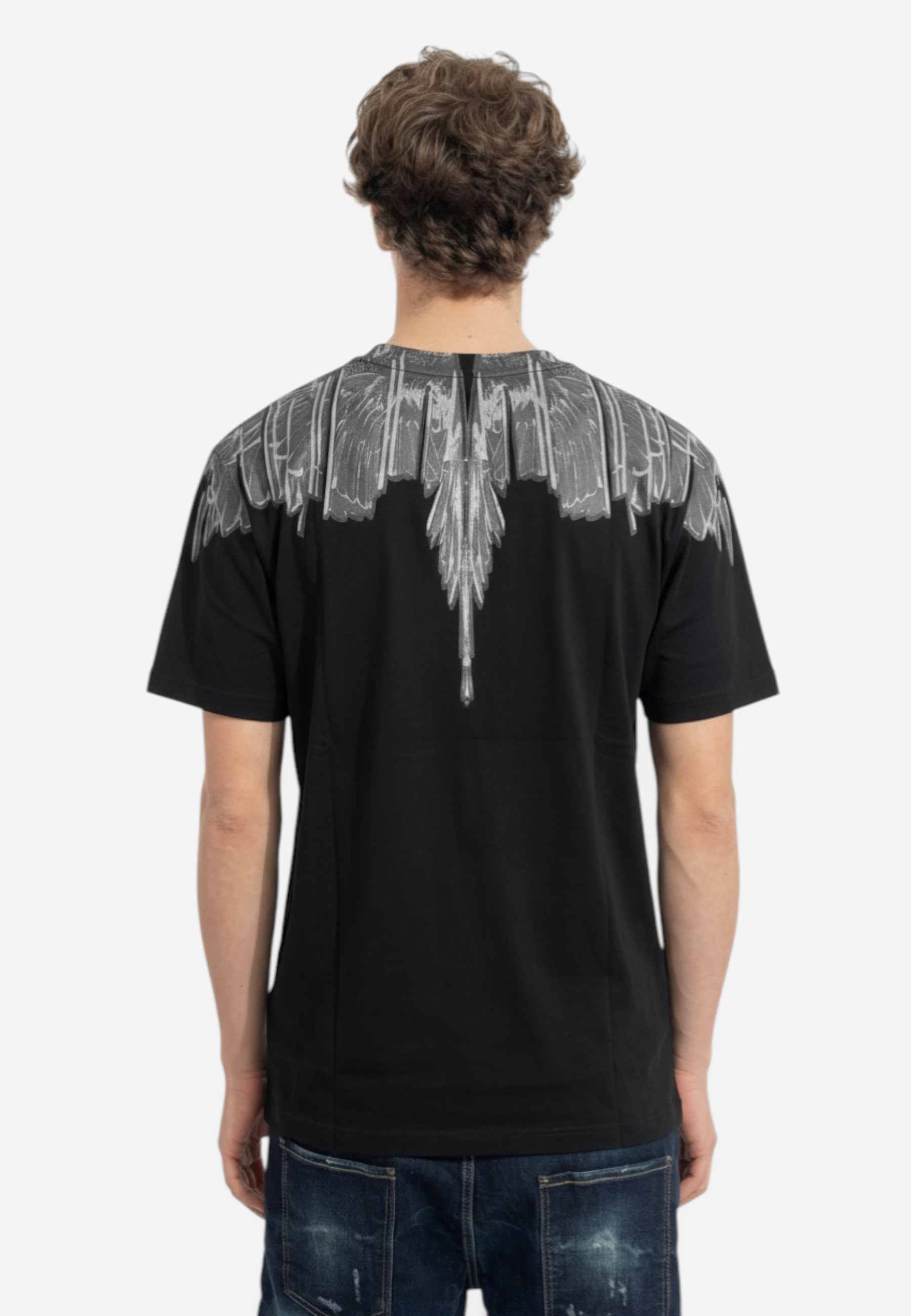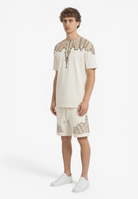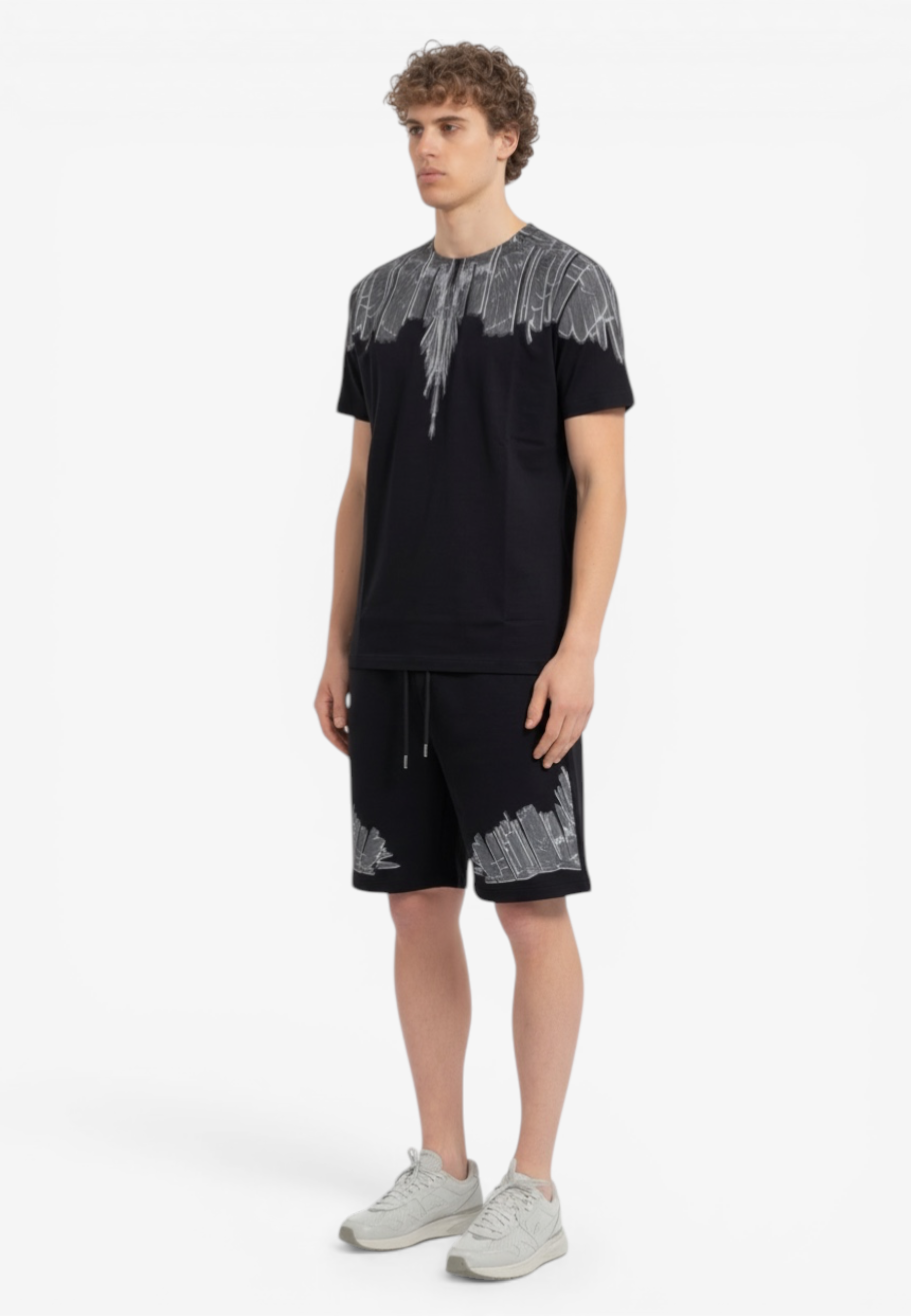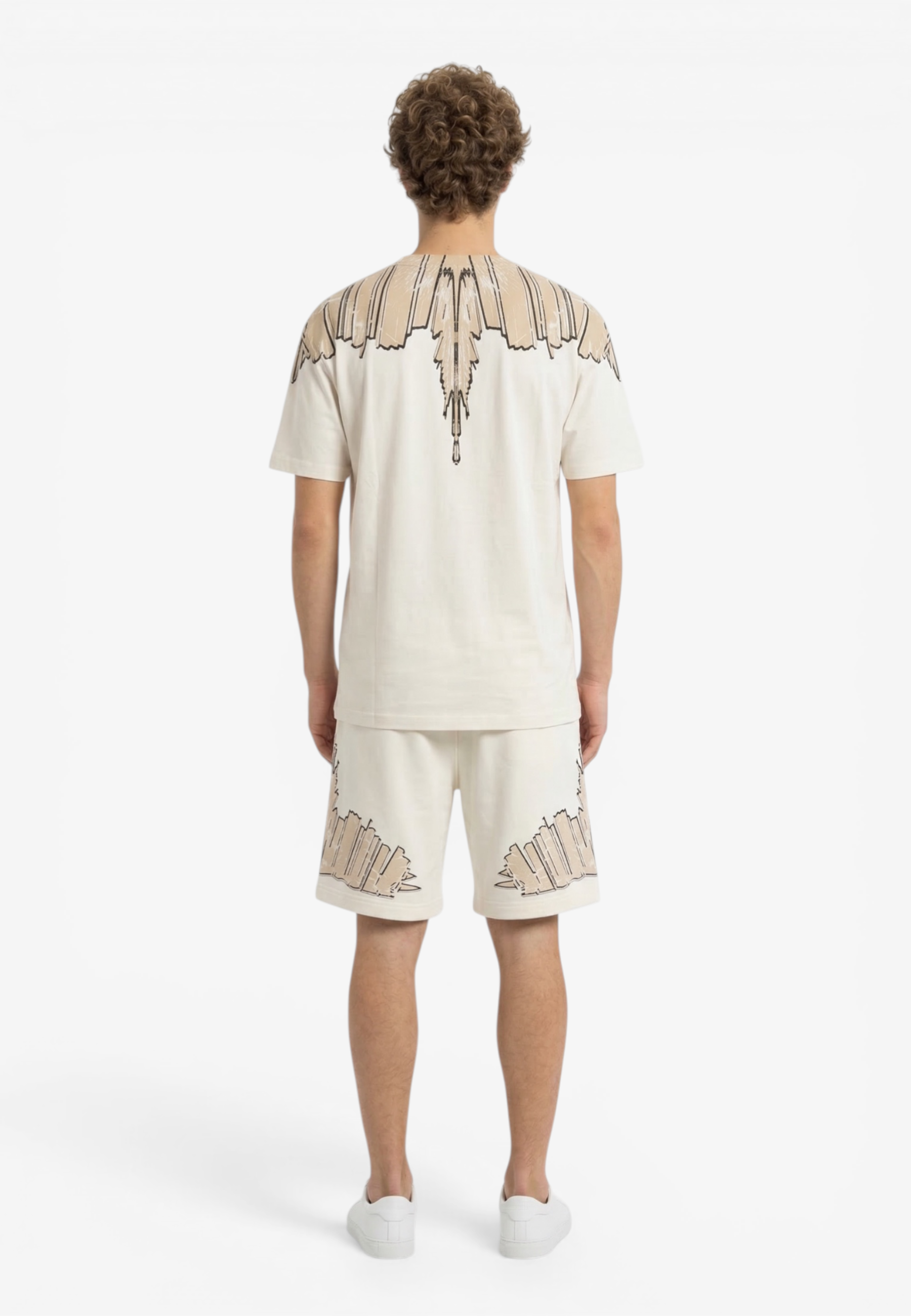 Coordinato a manica corta dal forte impatto visivo e dallo stile street contemporaneo, realizzata in cotone per offrire comfort e una vestibilità rilassata. Il design è caratterizzato da una stampa ali che avvolge collo e spalle l'estetica inconfondibile di Marcelo Burlon County of Milan. Un capo pensato per chi ama look urbani e di carattere Il modello indossa una taglia L nel colore cocco e una M nel colore nero ed è altro 187 cm
